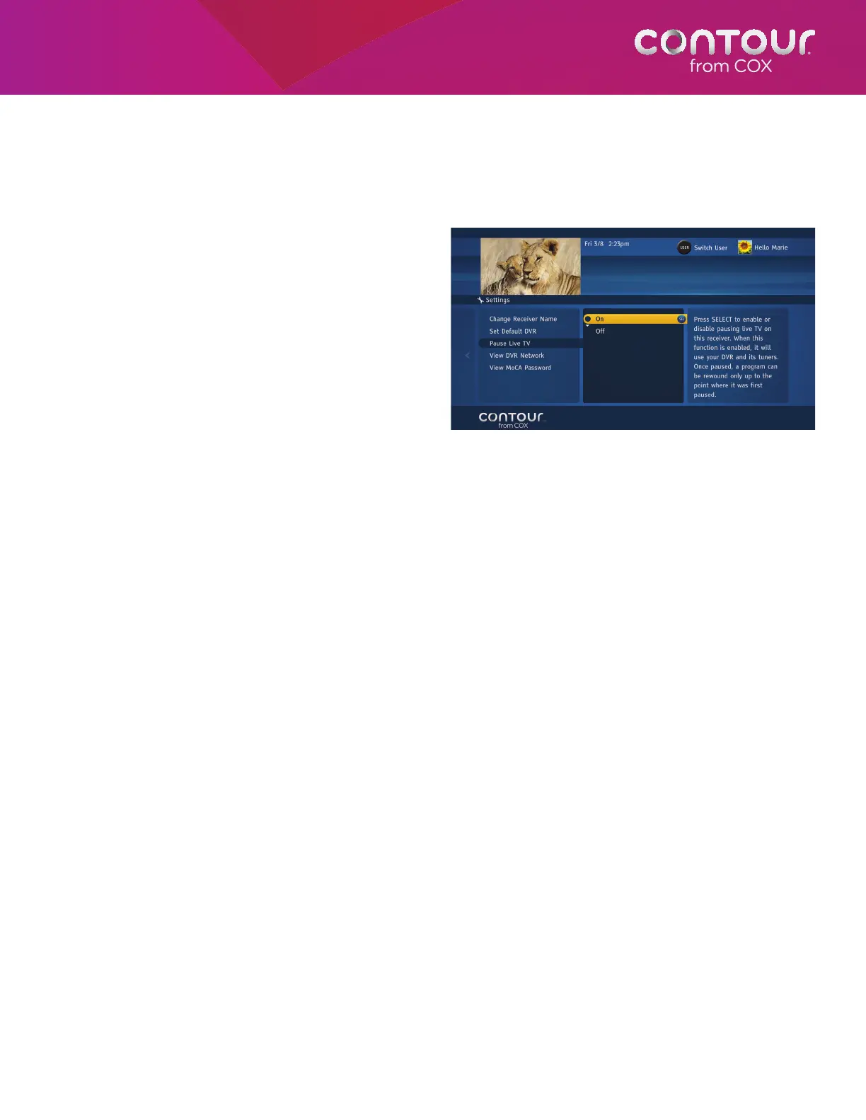 With the latest software upgrade from Cox, you can now pause live TV on your non-DVR receiver. Once a program is