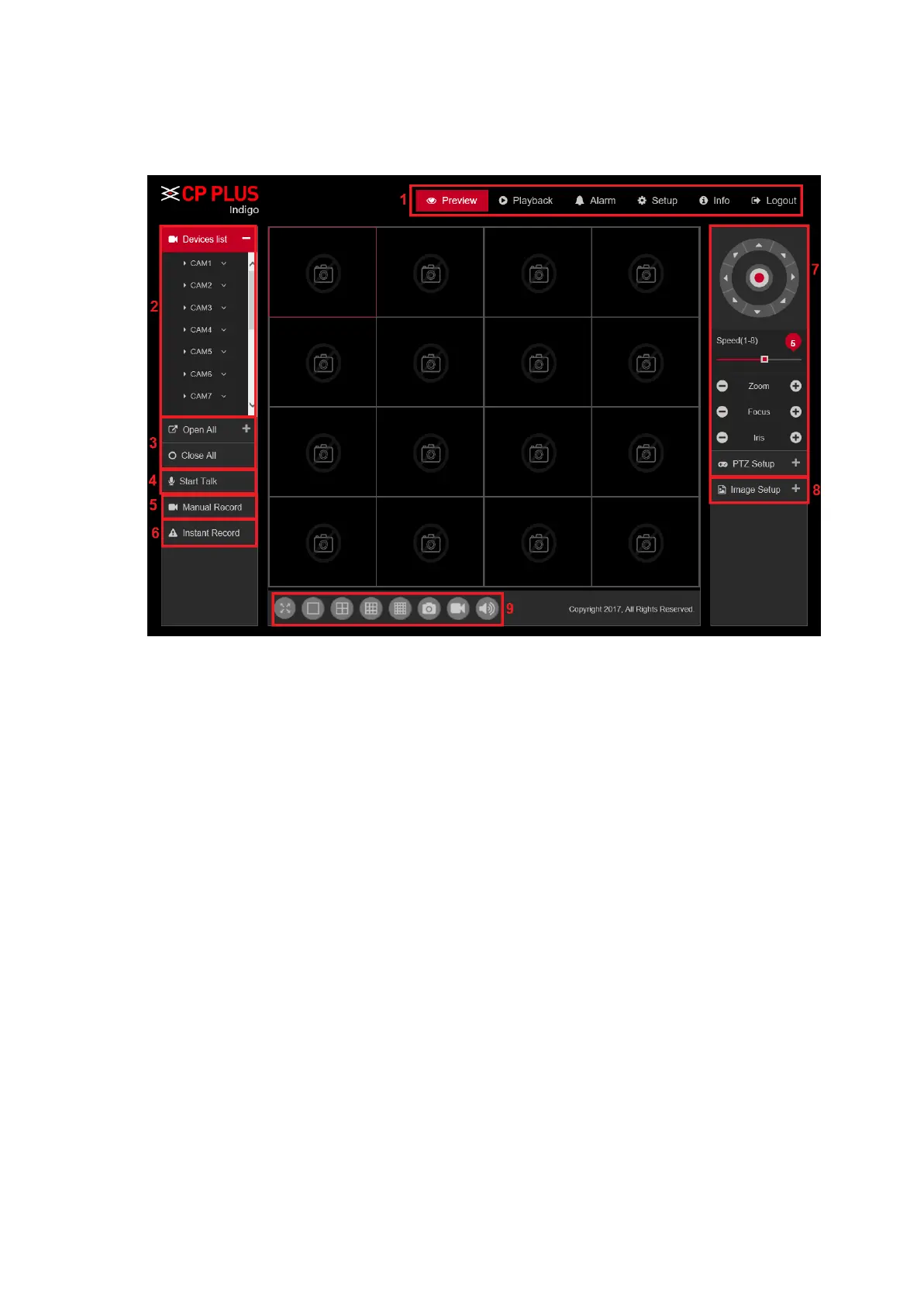 ⚫ Section 1: There are five function buttons: Preview, Playback, Alarm, Setup, Info, and Logout.