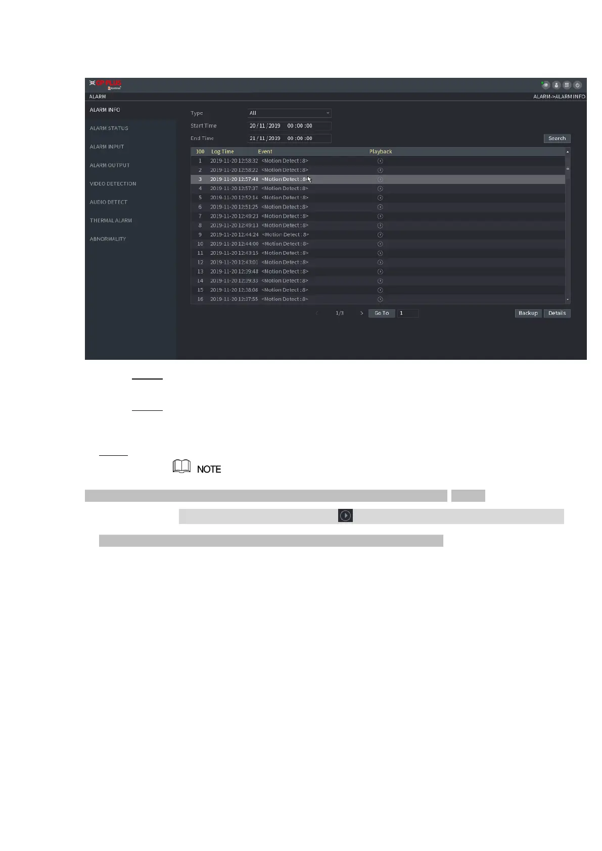 ⚫ Select an alarm event log and then click Backup to back up it to peripheral USB device.