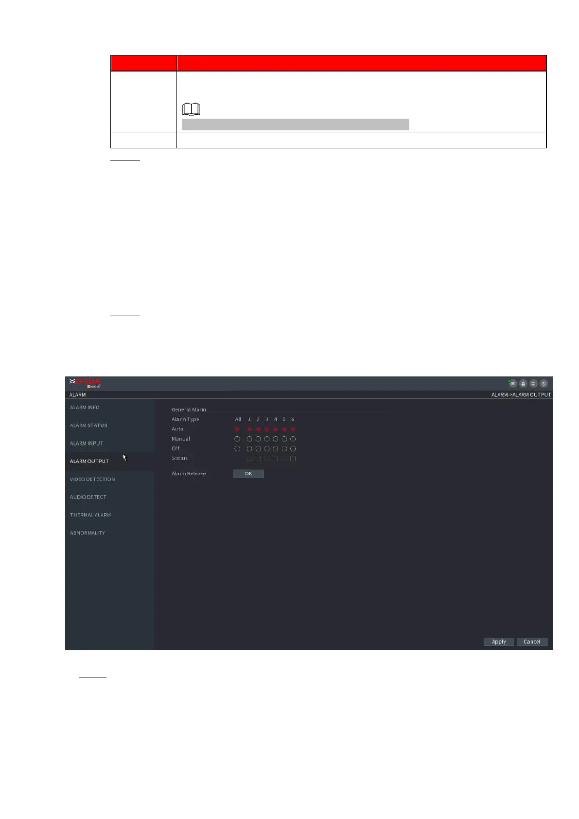 ⚫ You can set proper alarm output (Auto/manual/off). Connect the alarm device to the system alarm output