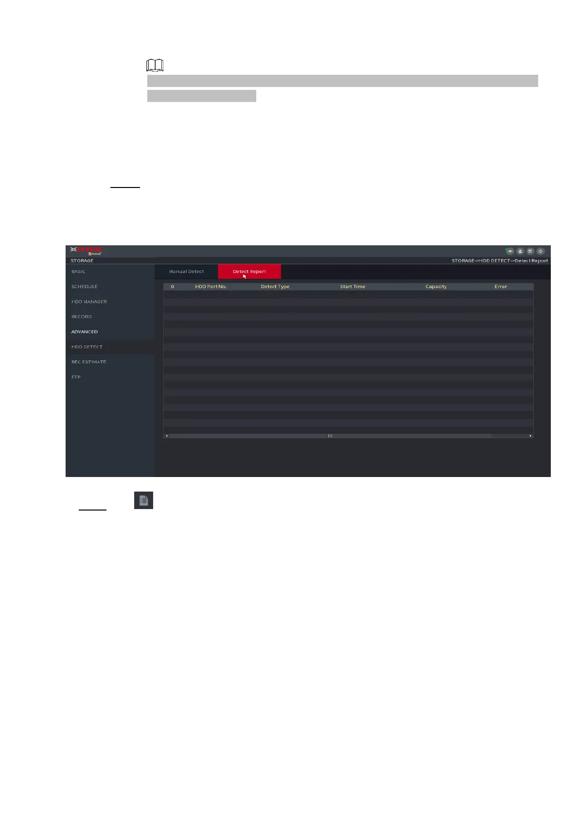 Step 1 Select Main Menu > STORAGE > HDD DETECT > Detect Report.