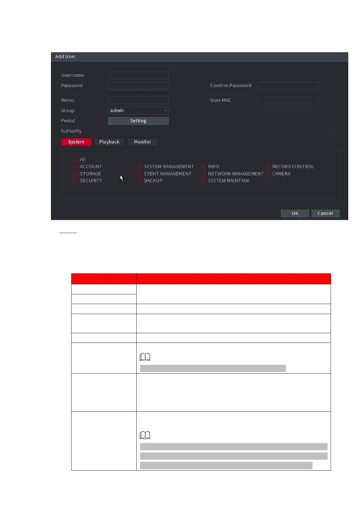 ⚫ Step 3 Input the user name, password, select the group it belongs to from the dropdown list.