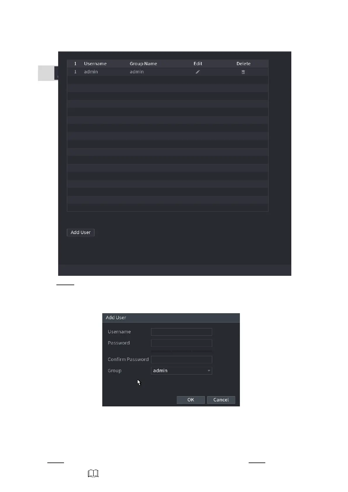 Step 3 Set user name, password and then select group from the dropdown list. Step 4 Click OK to complete