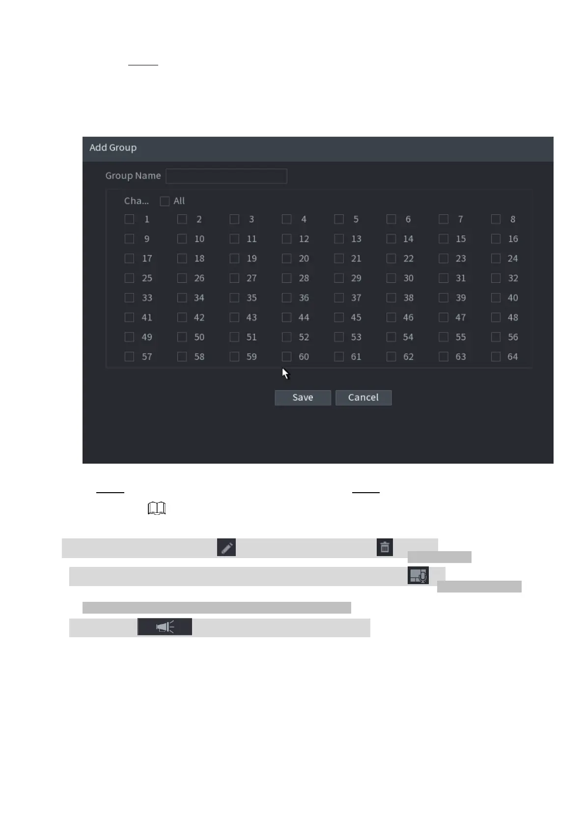 ⚫ Step 3 Input group name and select one or more channels. Step 4 Click Save button to complete
