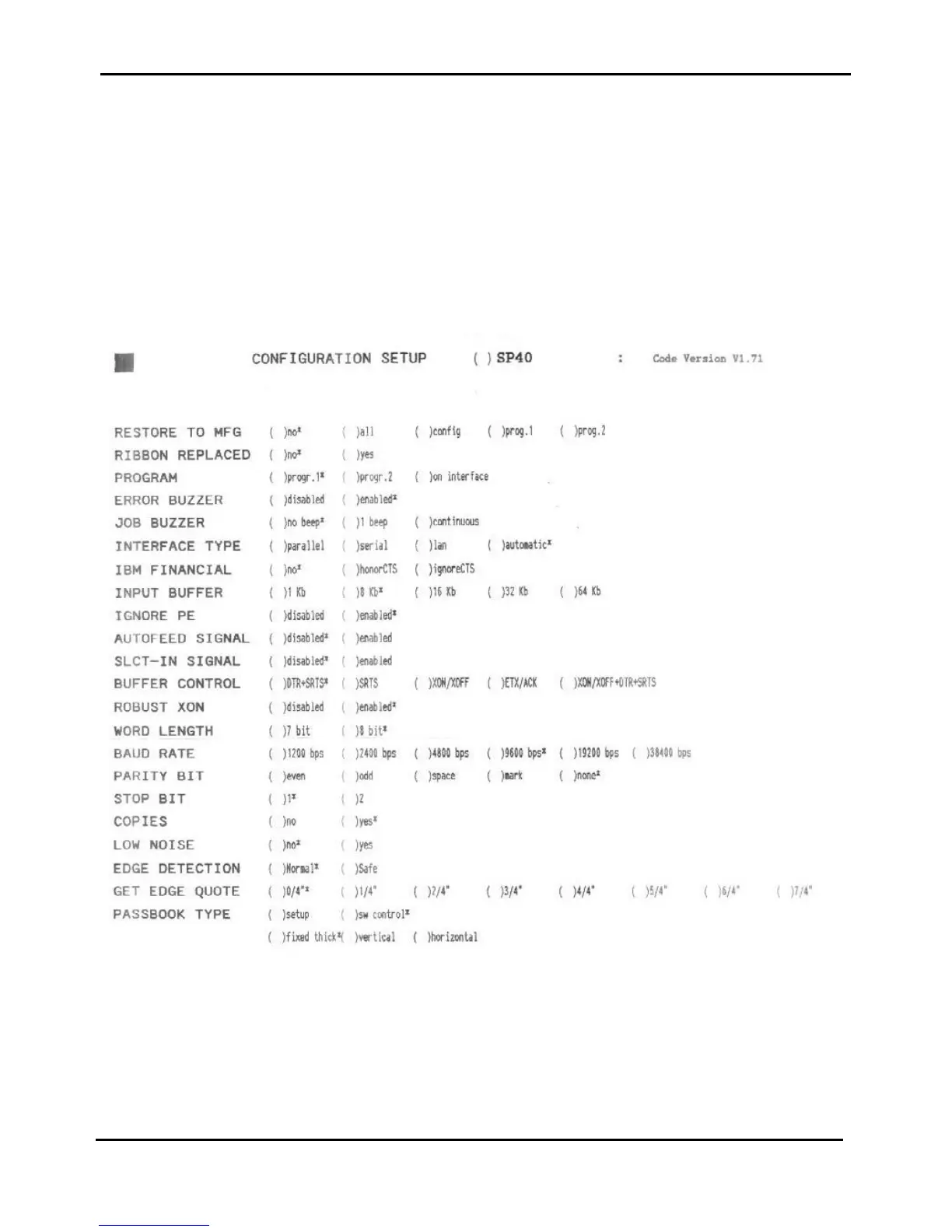 The following figures and tables are the setup forms printed by the printer with their meaning.