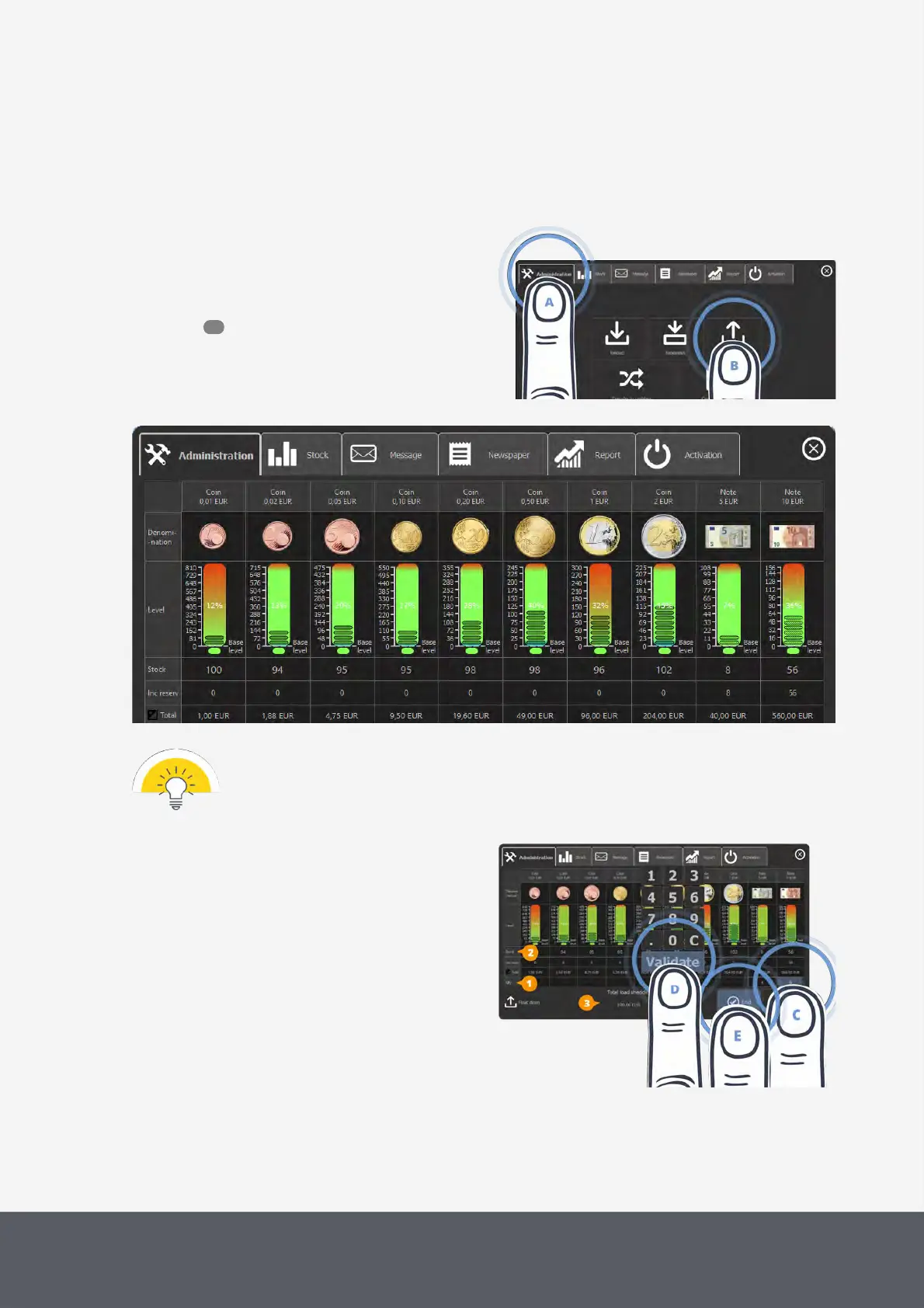 The screen only displays those coins and banknotes with a stock.