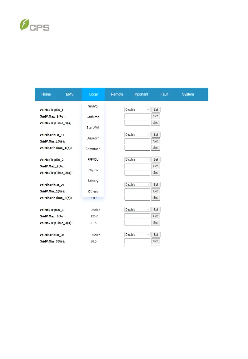 For GridVol, GridFreq, Start/Vrt, Dispatch, Command, Battery, Others sub-menus,