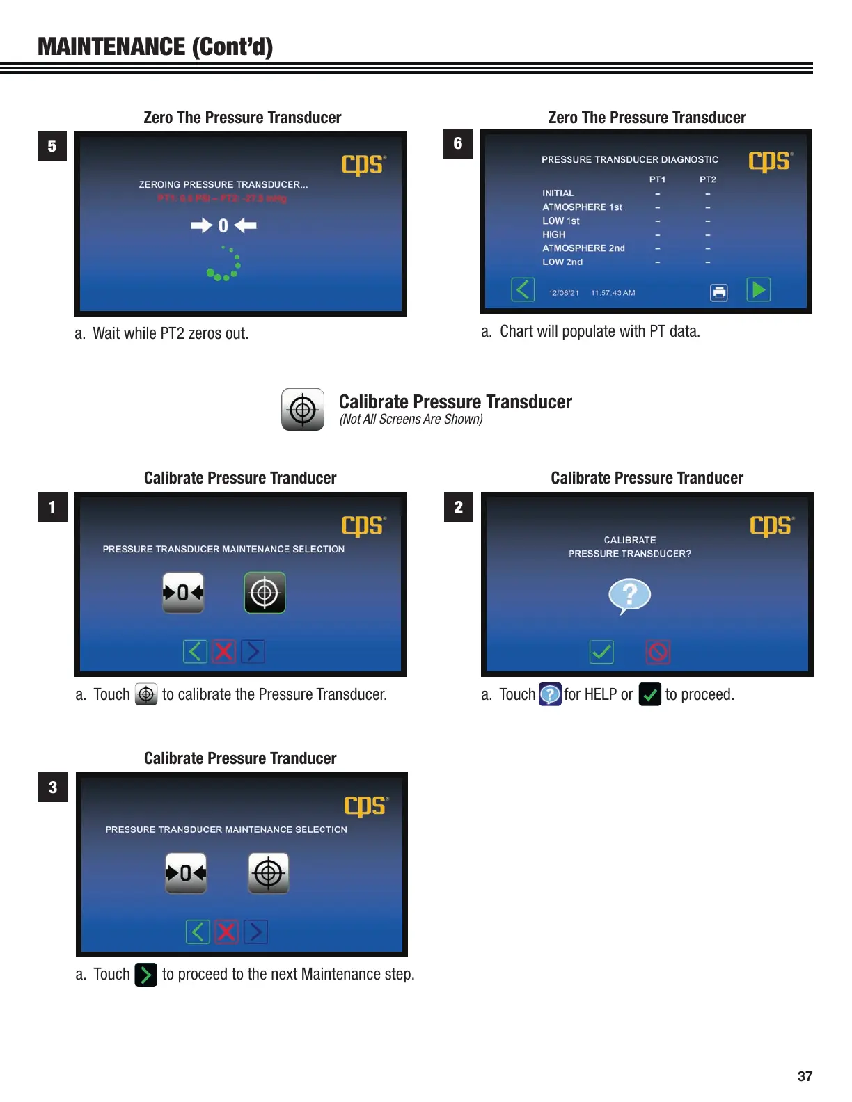 a. Touch for HELP or to proceed.a. Touch to calibrate the Pressure Transducer.