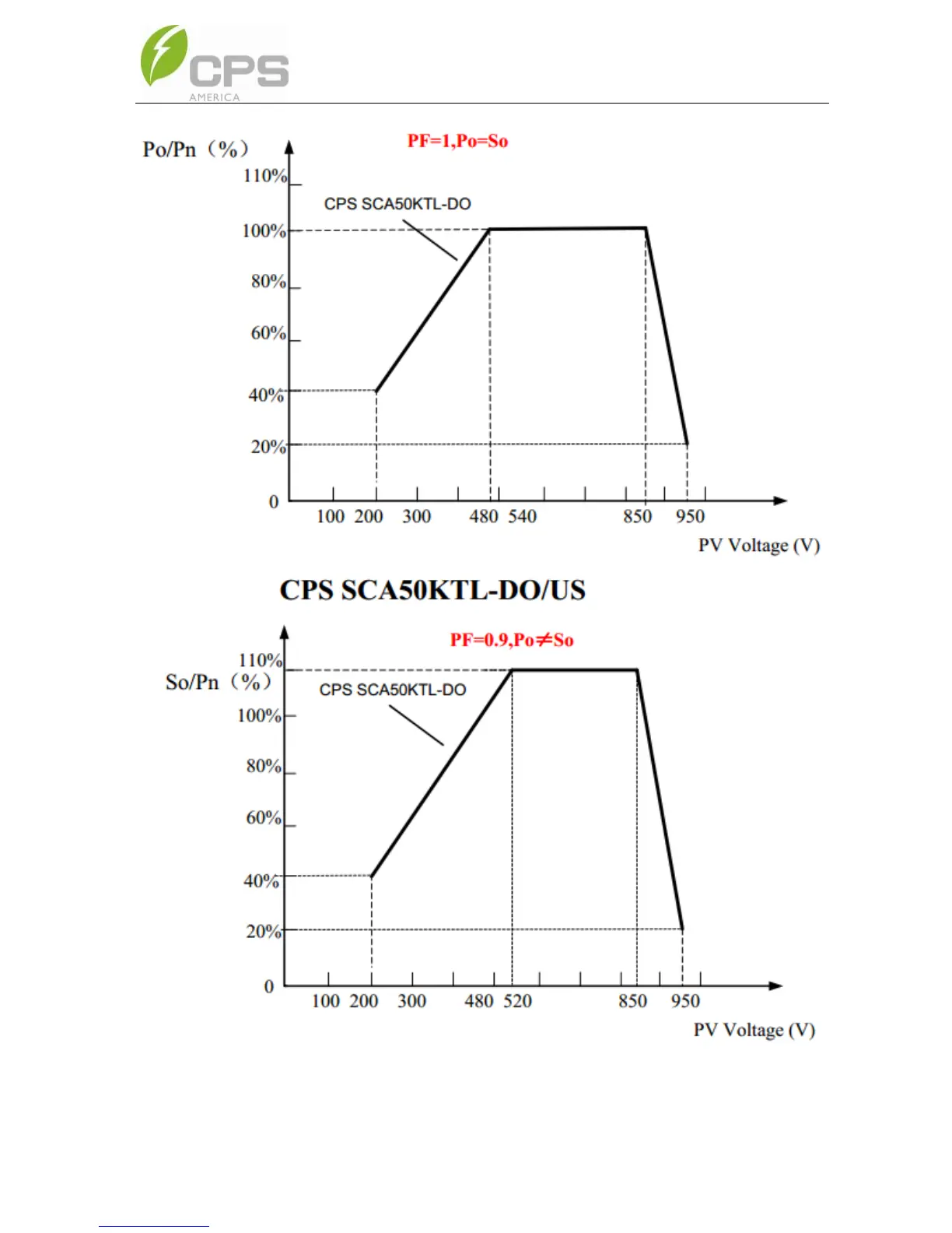 Figure 10-1 CPS SCA50KTL kW and kVA derating curves of PV input voltage