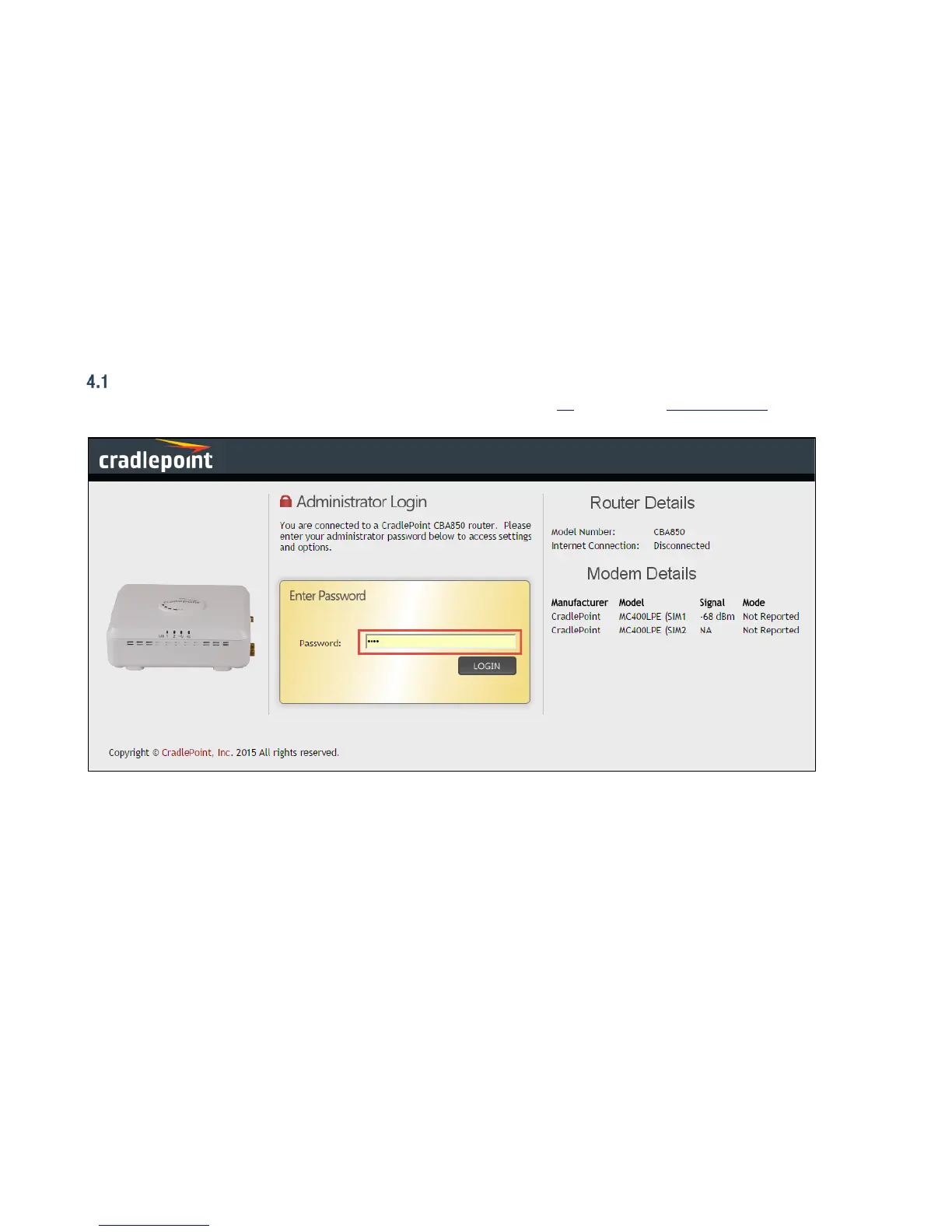 Log in using your administrator password. Initially, this password can be found on the bottom of the CBA850 unit as the Default