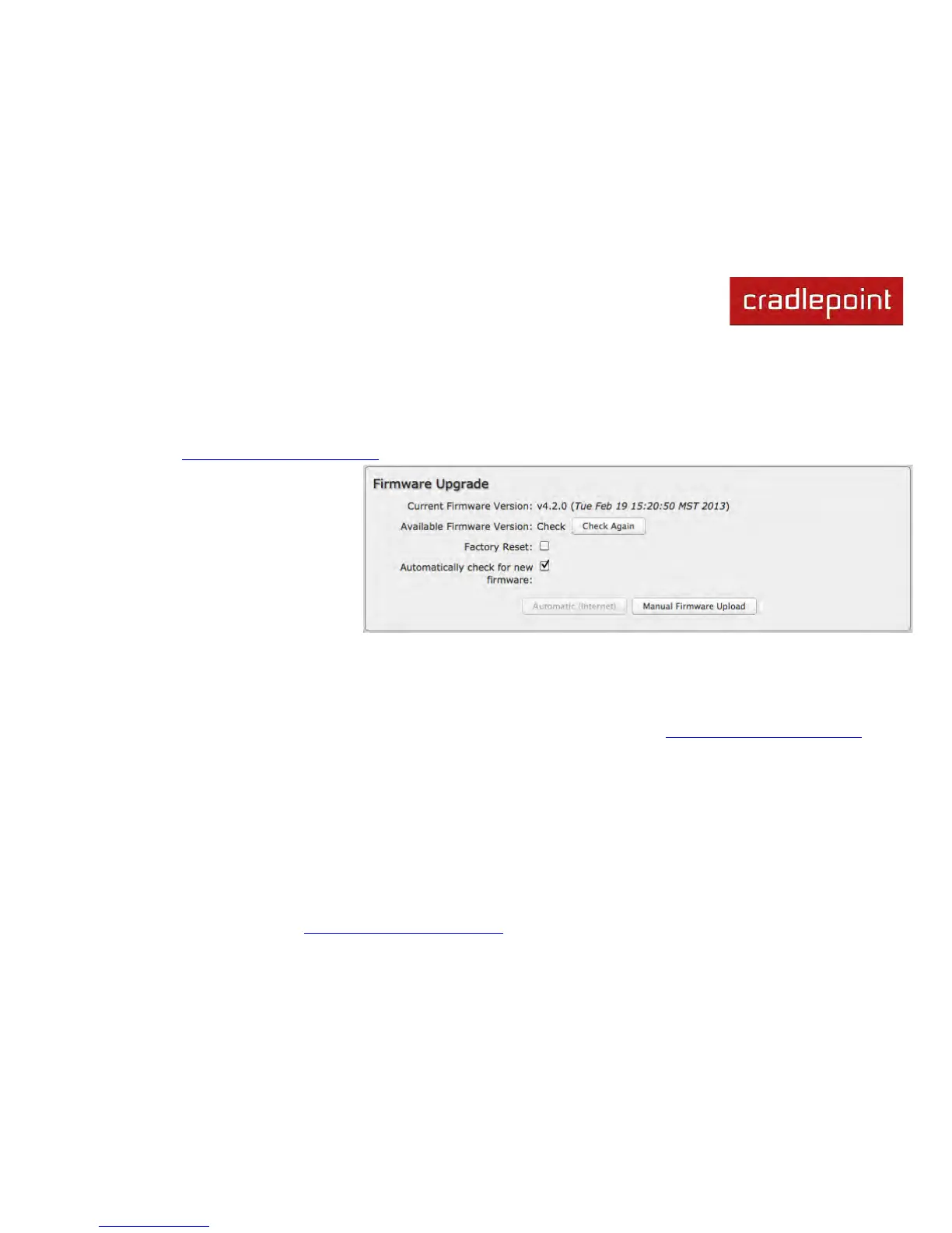 Manual Firmware Upload: Upload the router firmware from an attached computer. (Go to www.cradlepoint.com/firmware