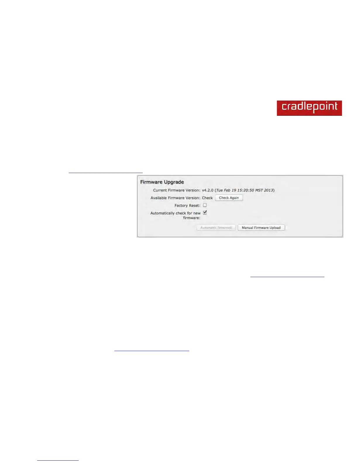 Manual Firmware Upload: Upload the router firmware from an attached computer. (Go to www.cradlepoint.com/firmware
