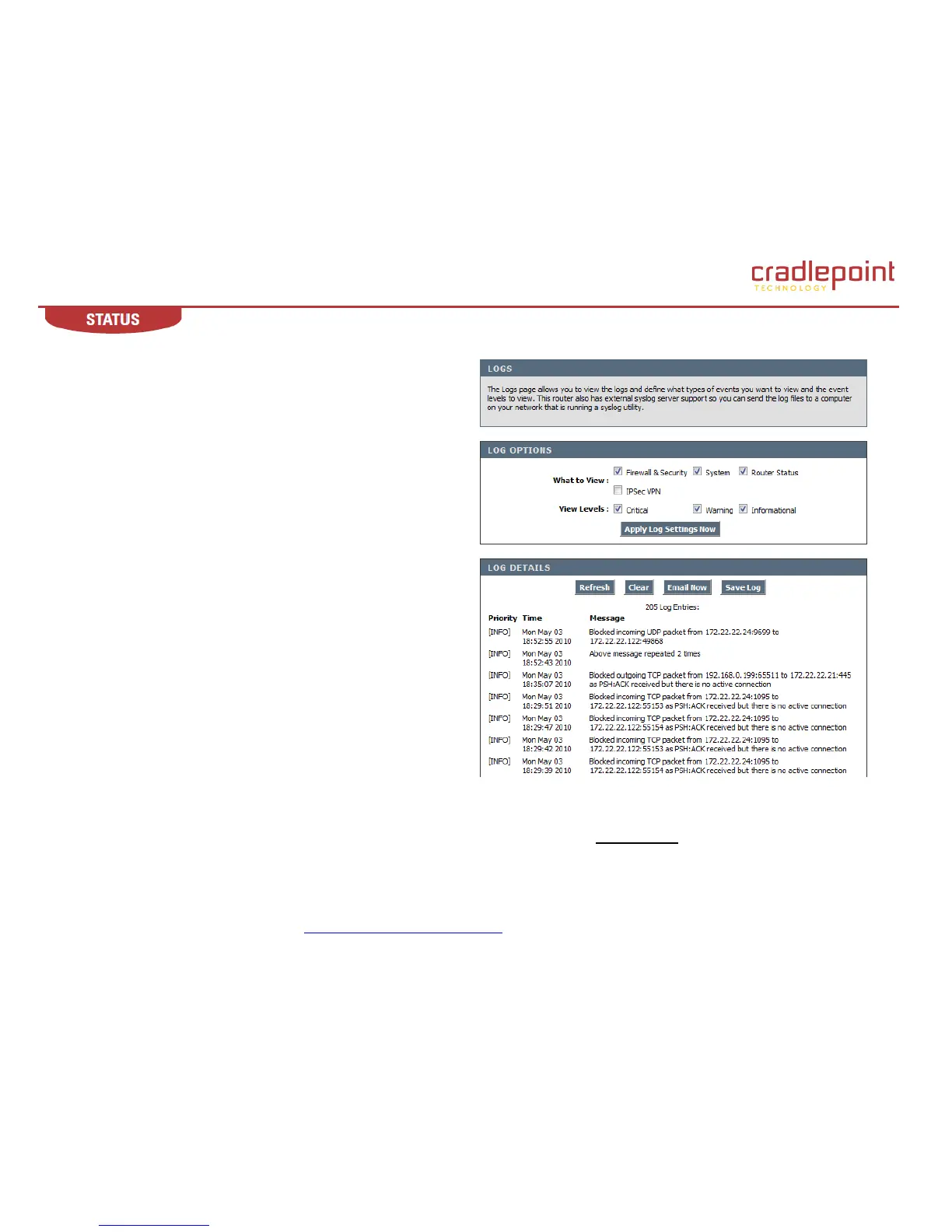 Email Now. This option will send a copy of the router log to the email address configured in the Tools → Email sub-menu.