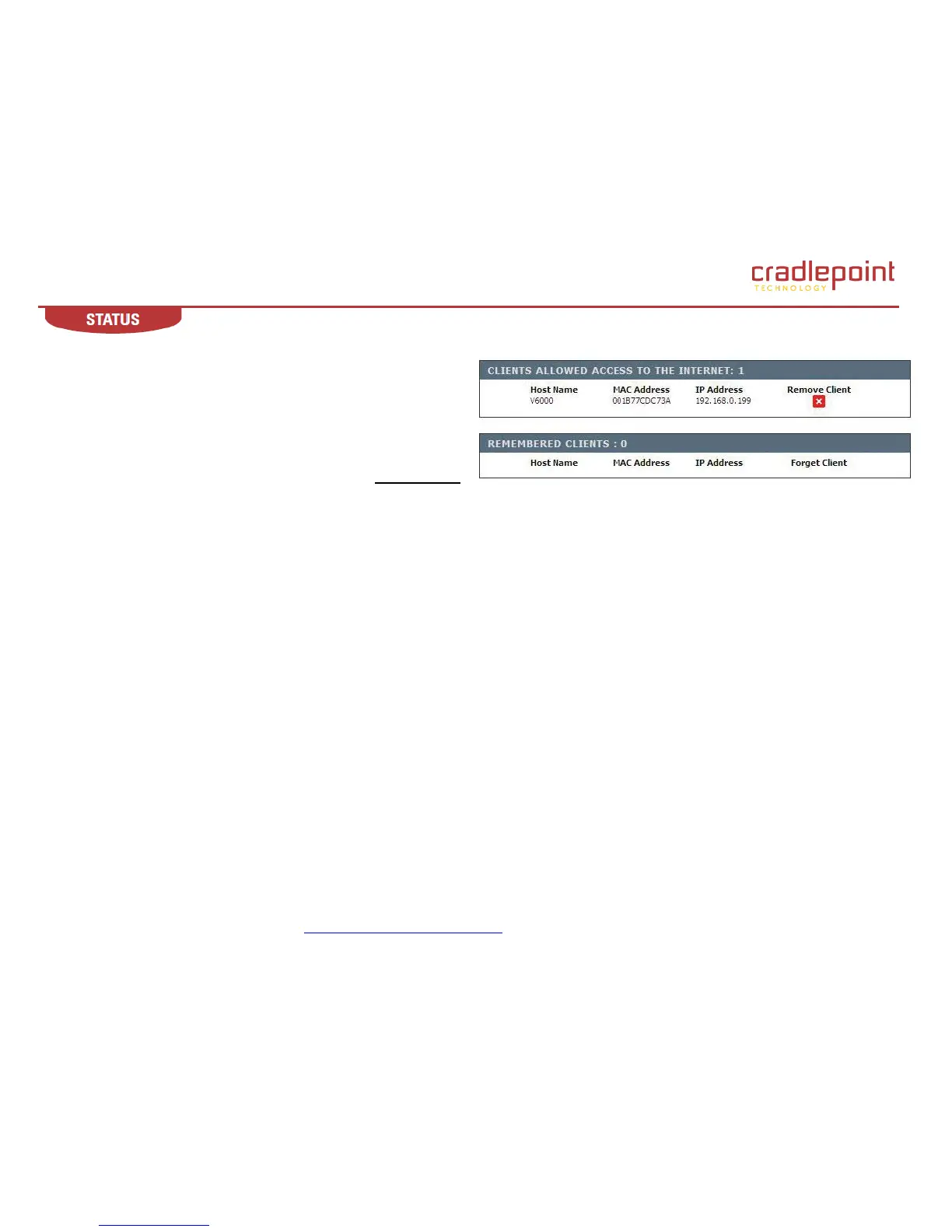 remembering its MAC address, eliminating the need to login each time. NOTE: Remembered Clients are “forgotten” if you reset the MBR1200 to