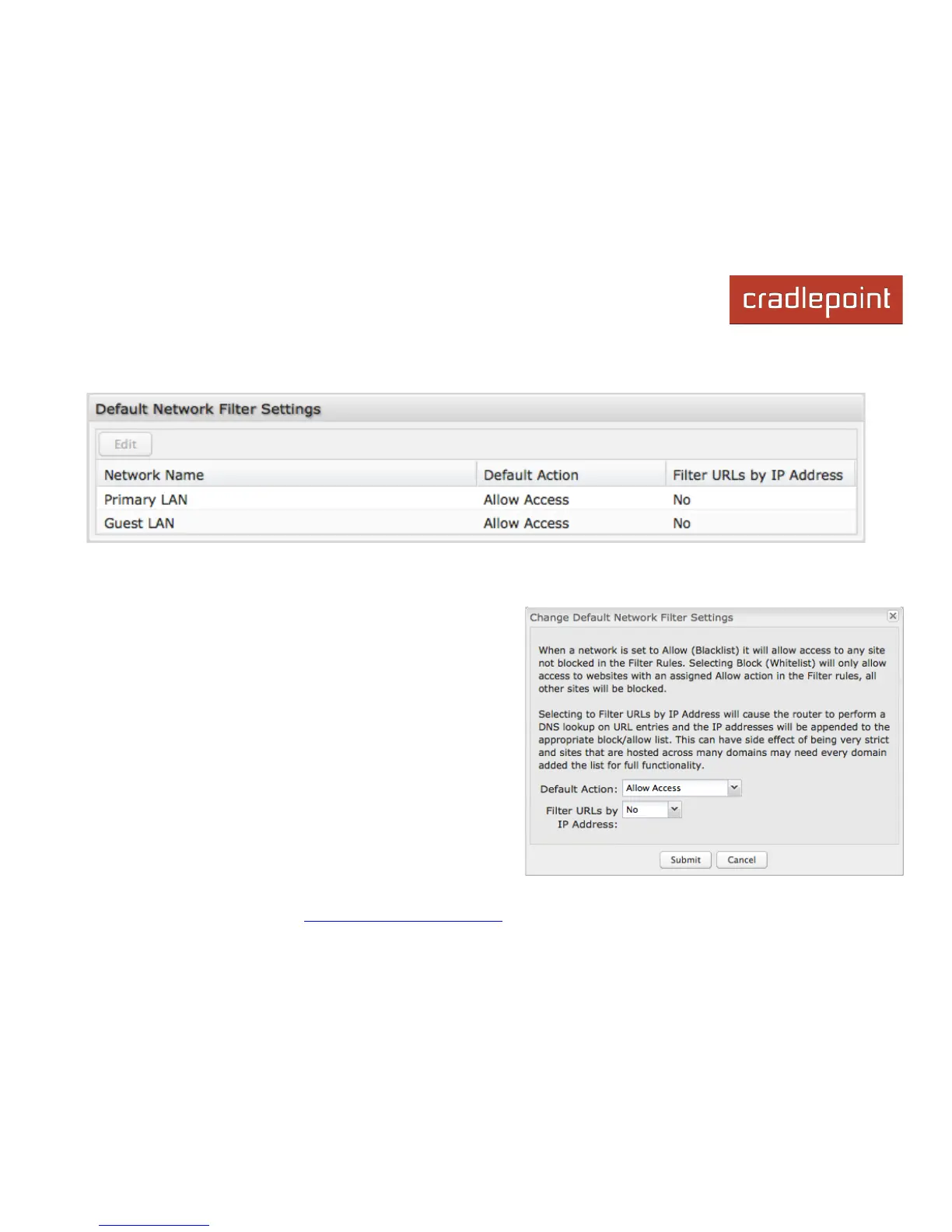 networks are set to allow website access by default. Select a network and click Edit to change the default filter settings.