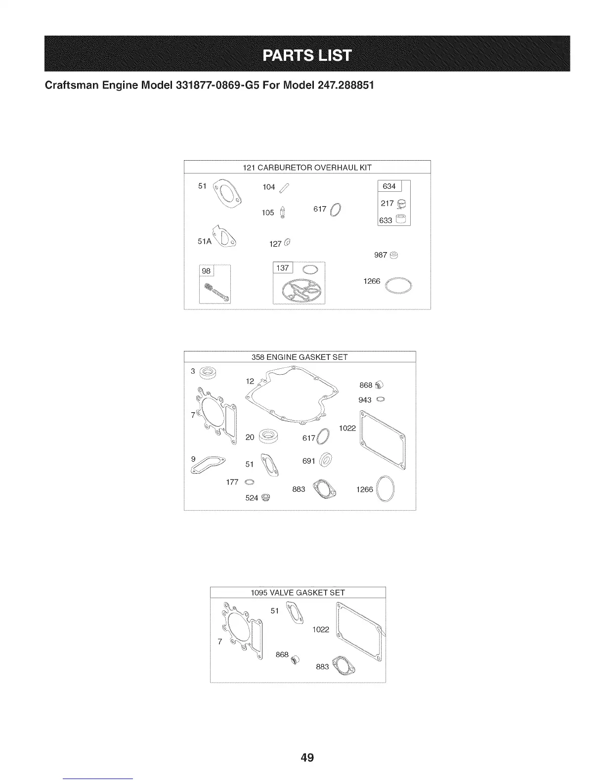 Craftsman Engine Model 331877=0869=G5 For Model 247.288851