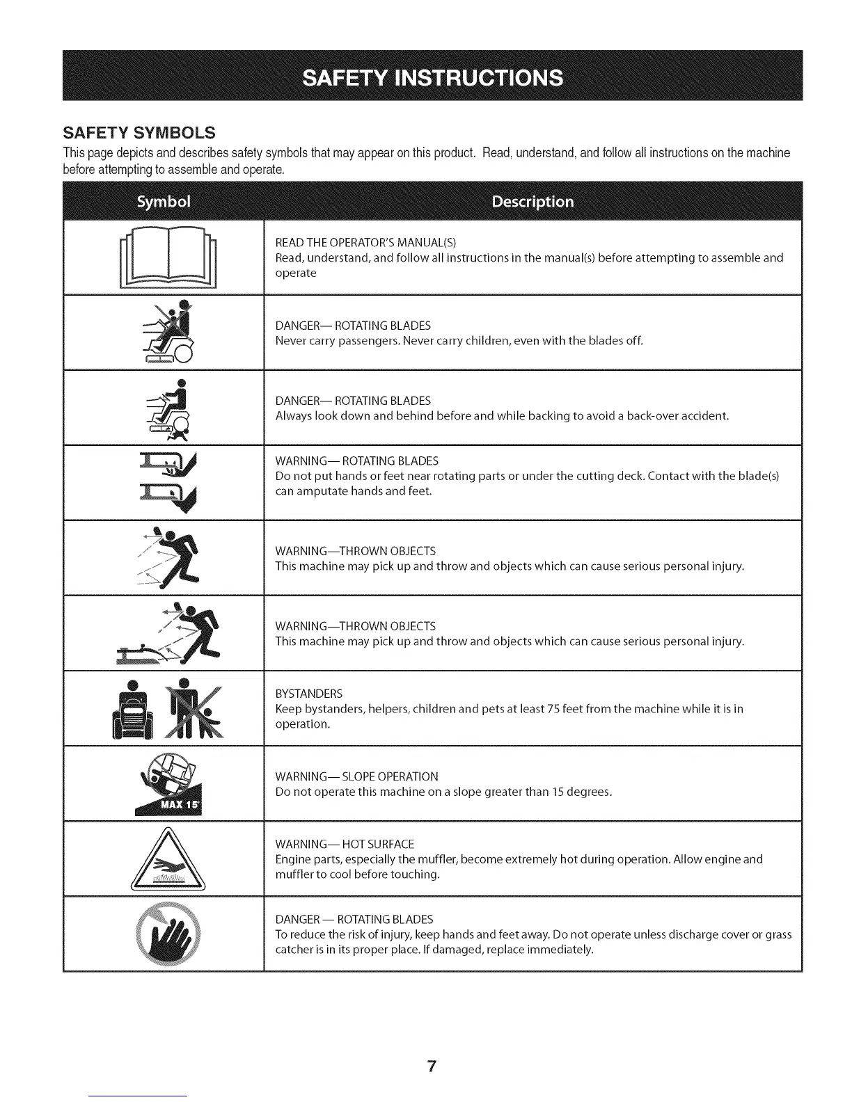 Do not put hands or feet near rotating parts or under the cutting deck. Contact with the blade(s)