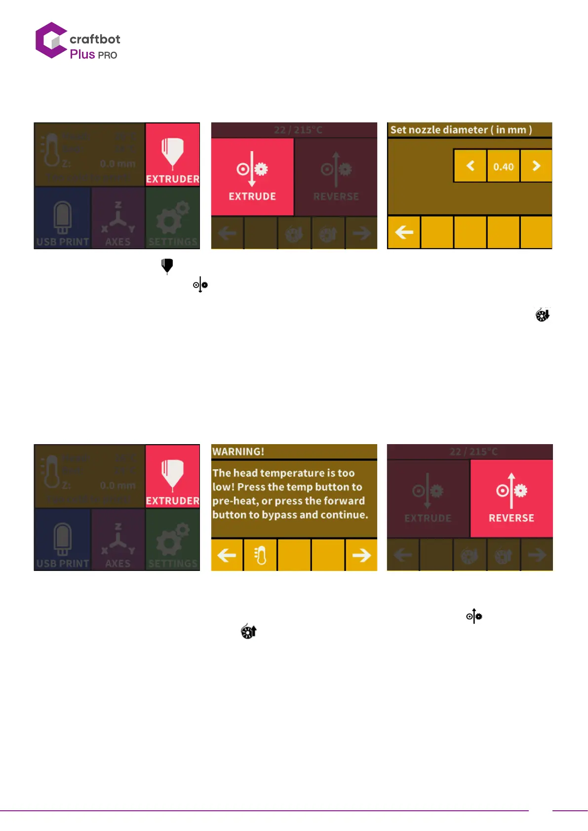 • You can also use the “extrude” menu to extrude the filament. This will only rotate the gear wheel every time