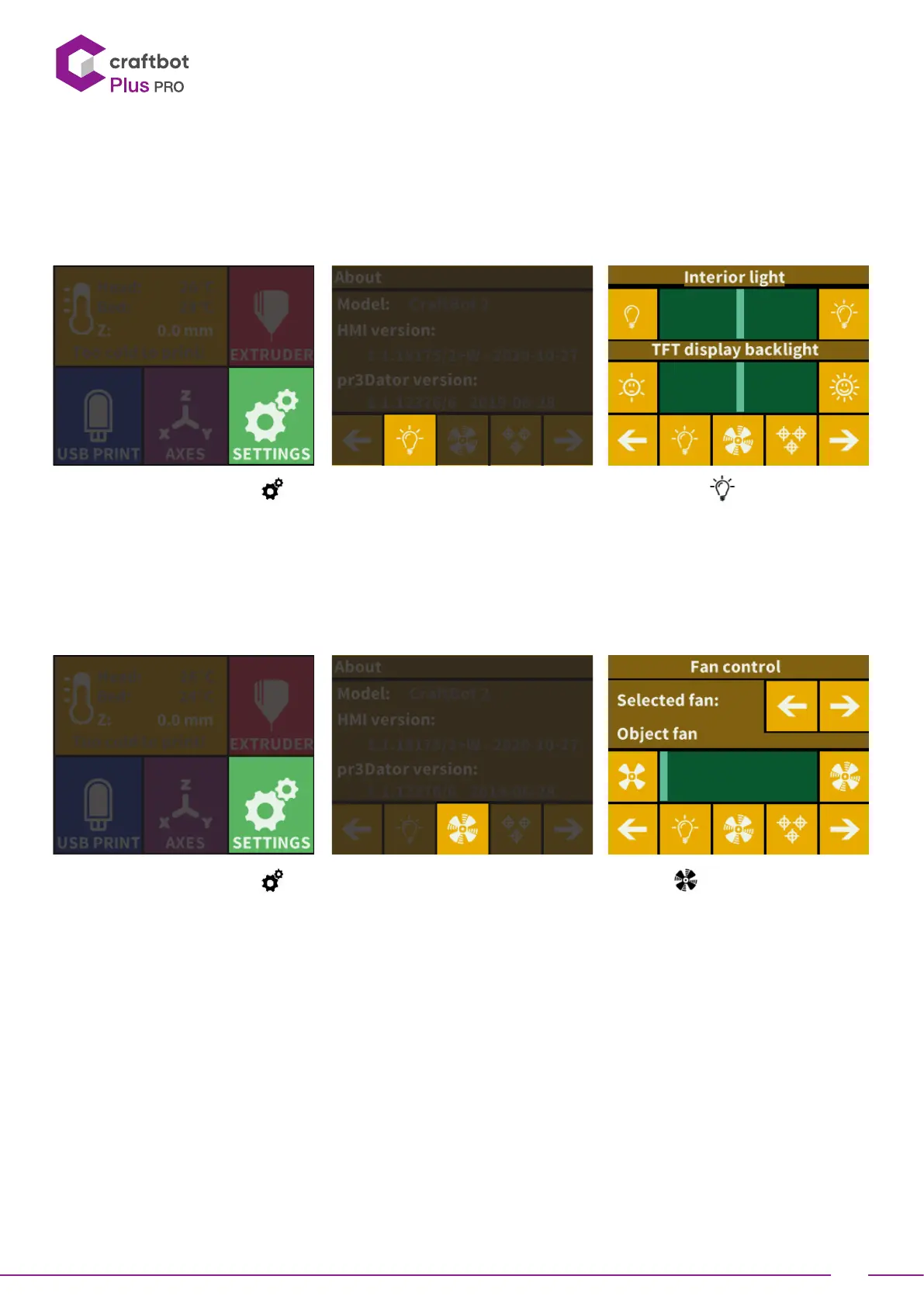 • Switch between 3 fans (object, extruder, case ) by pressing arrows. The name of the fan to be controlled is displayed