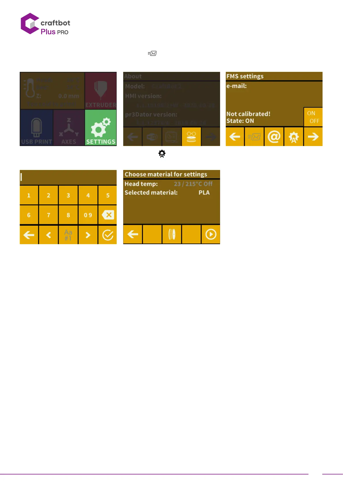 • Calibration can be initiated by touching the icon . You can set the head temperature here. You can calibrate