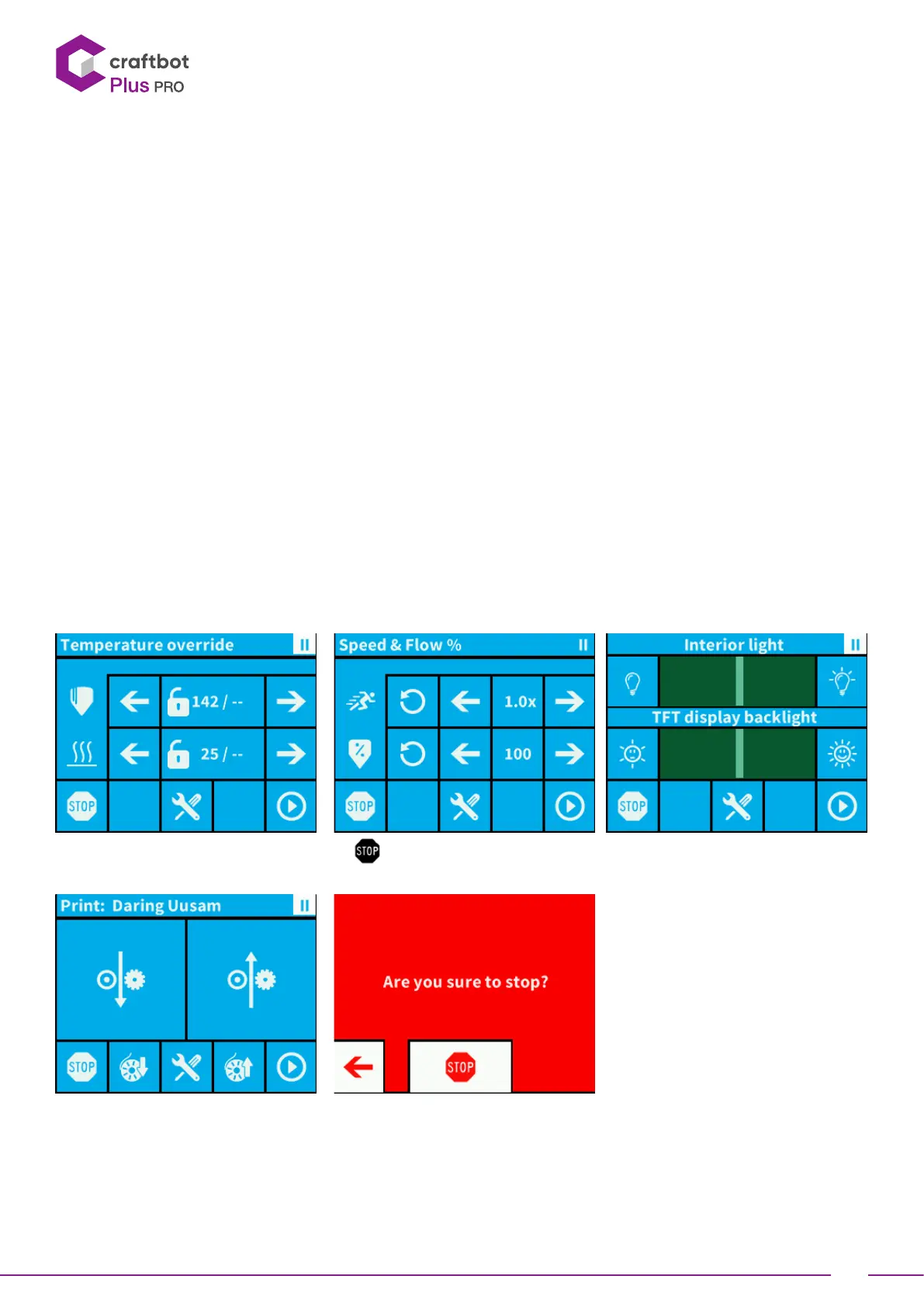 For terminating the printing select “STOP” . The CraBot will ask for a confirmation again before stopping. If you