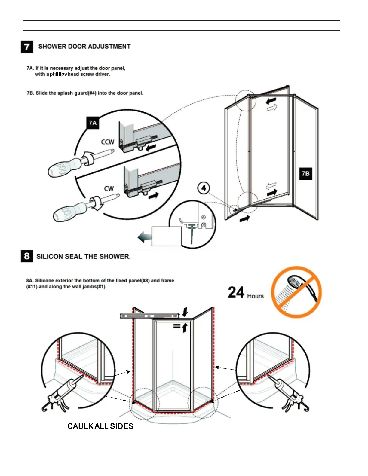Craft+Main TIDES NEO-ANGLE - Installation Procedure: Step 7; Adjust Door Panel and Splash Guard; Installation Procedure: Step 8; Apply Silicone Sealant