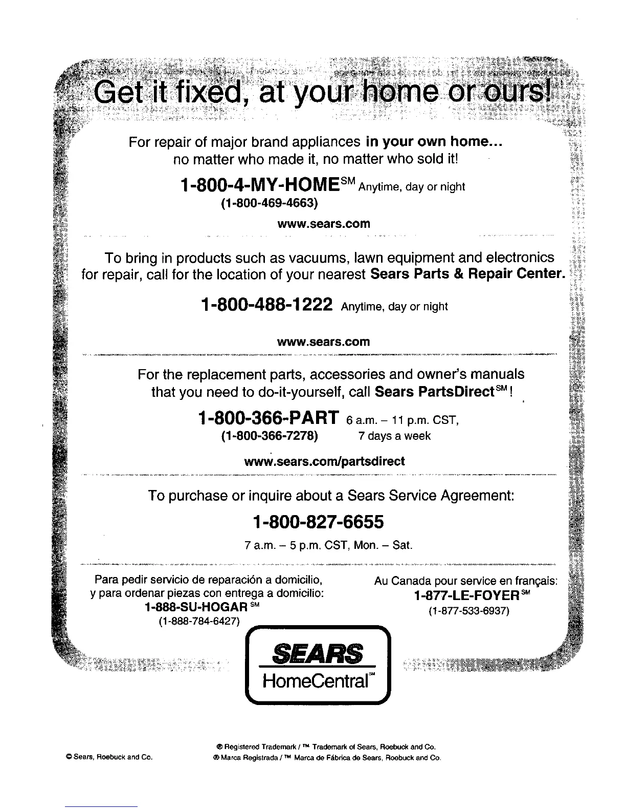 for repair, call for the location of your nearest Sears Parts & Repair Center.