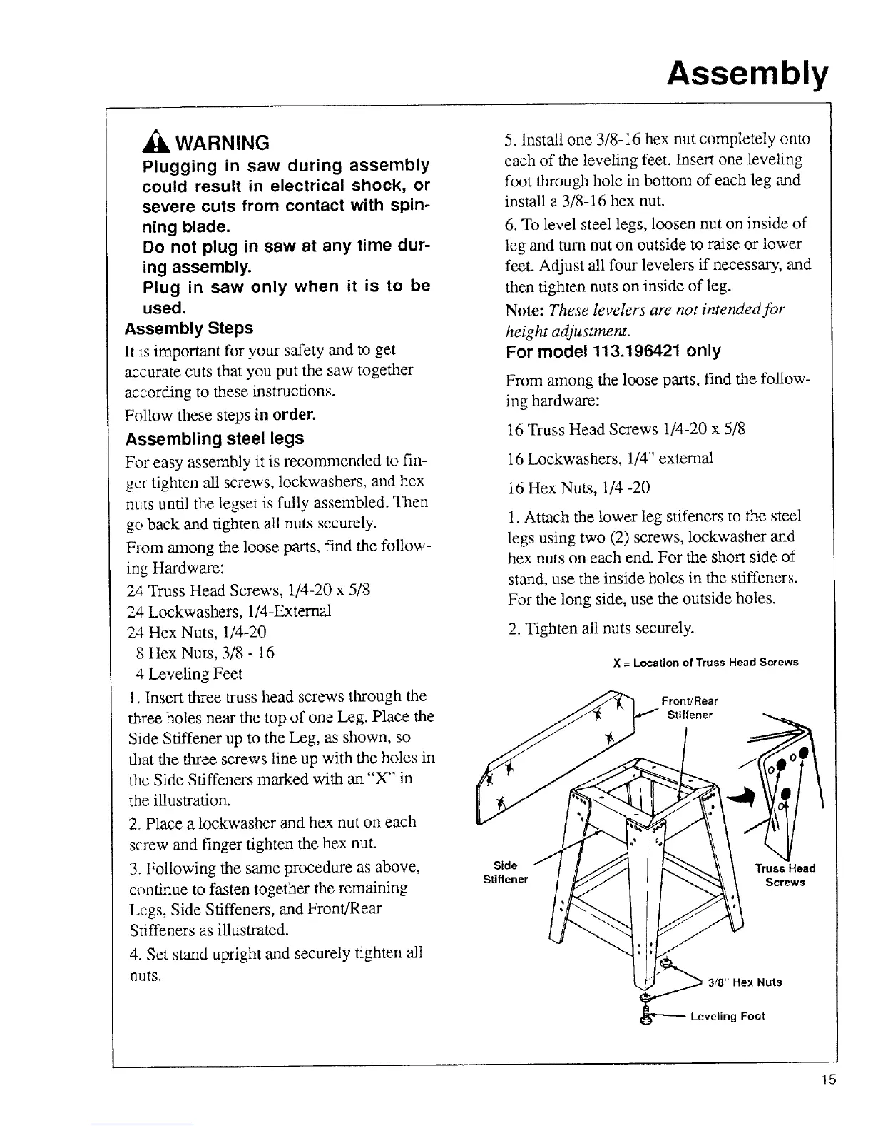 6. To level steel legs, loosen nut on inside of