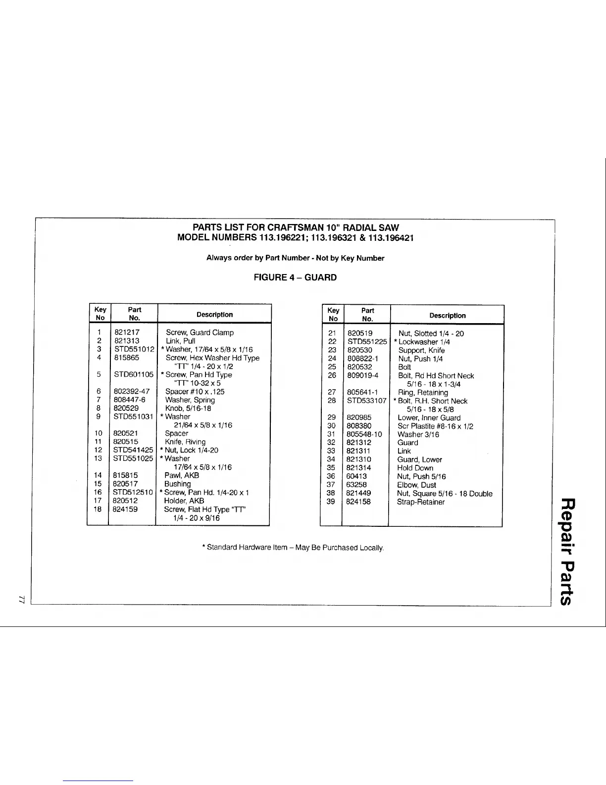 PARTS LIST FOR CRAFTSMAN 10" RADIAL SAW