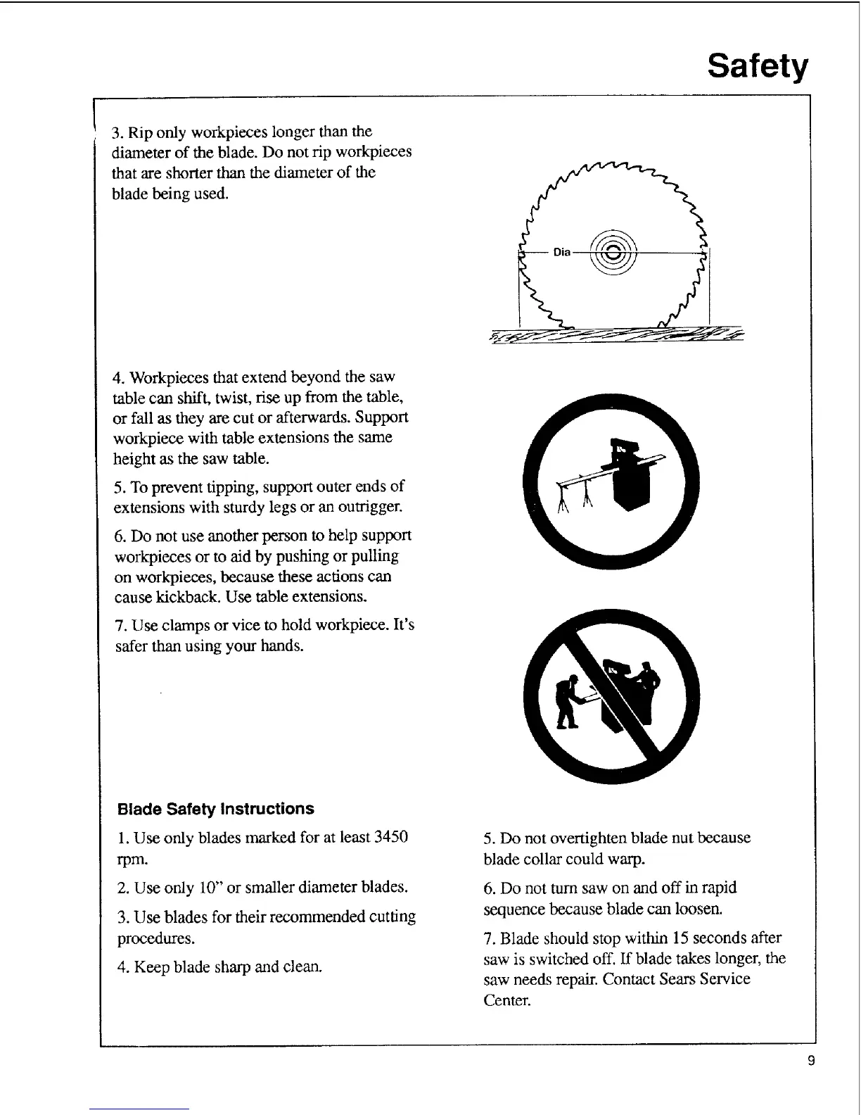 diameter of the blade. Do not rip workpieces