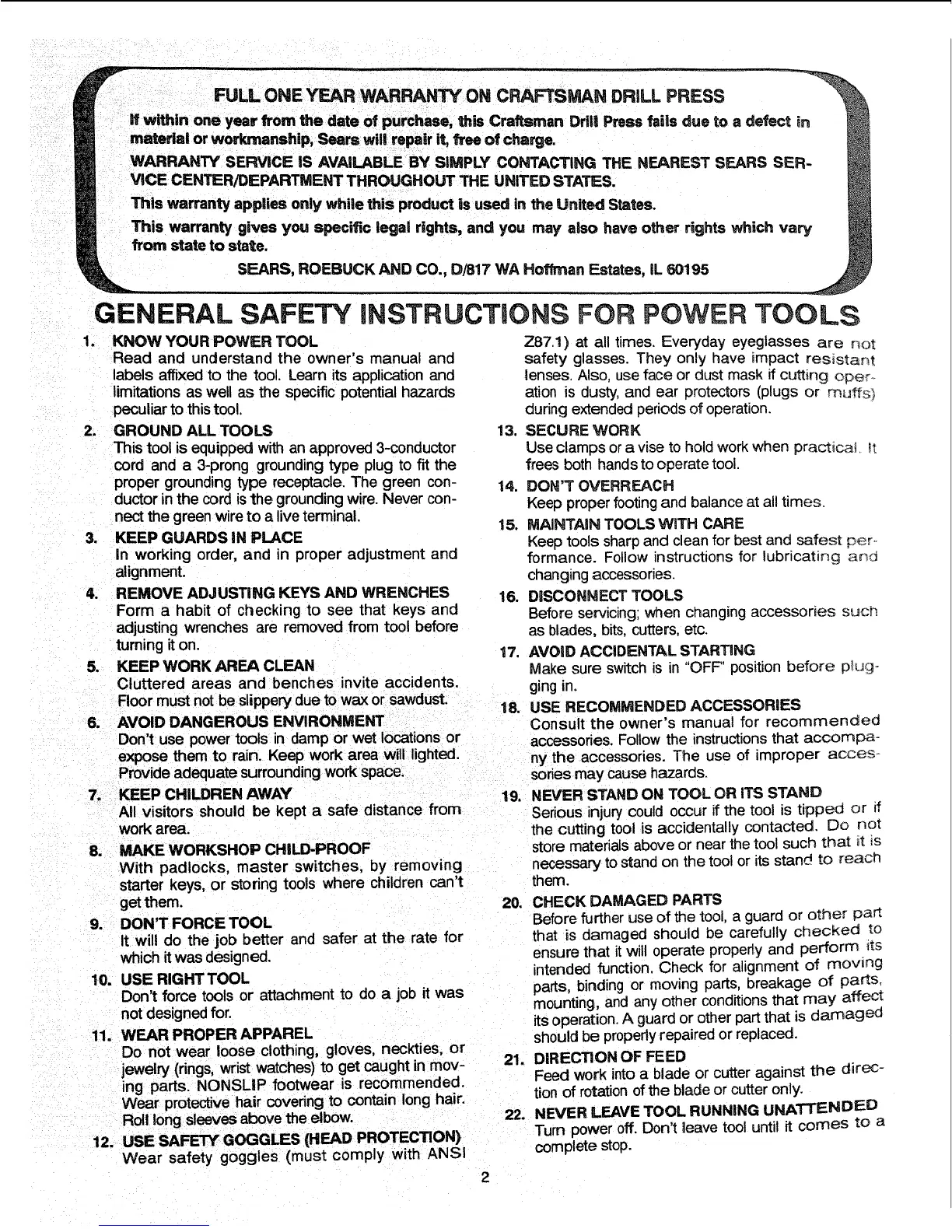 FULL ONE YF.AR WARRANTY ON CRAFTSMAN DRILL PRESS