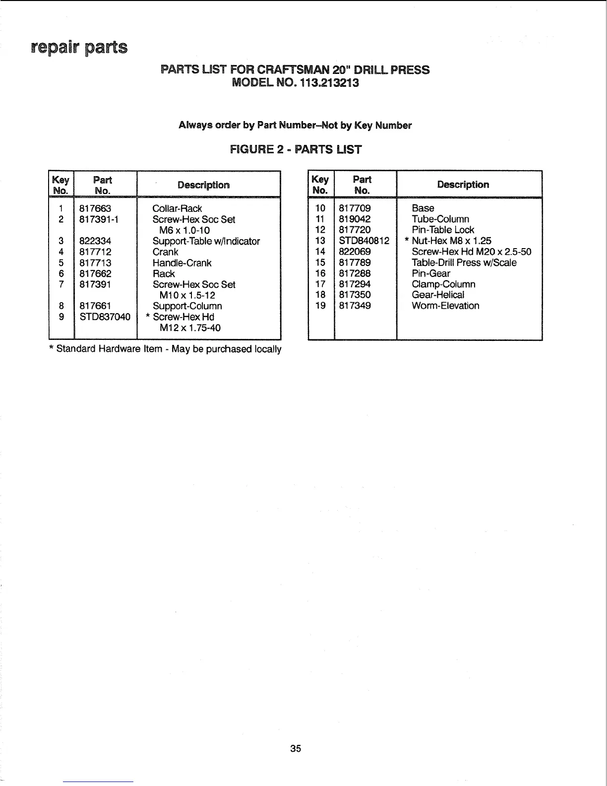 PARTS LIST FOR CRAFTSMAN 20" DRILL PRESS