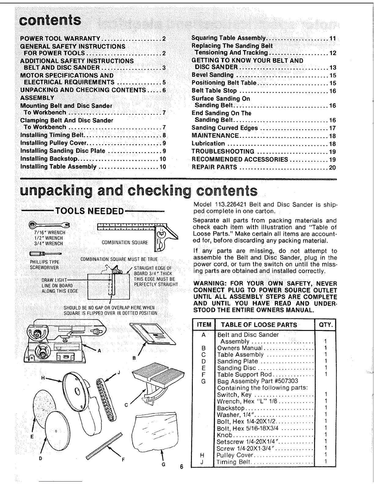 Squaring Table:Assembly; ....................... 11