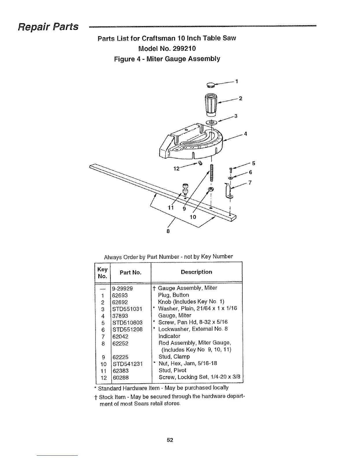 Parts List for Craftsman 10 Inch Table Saw