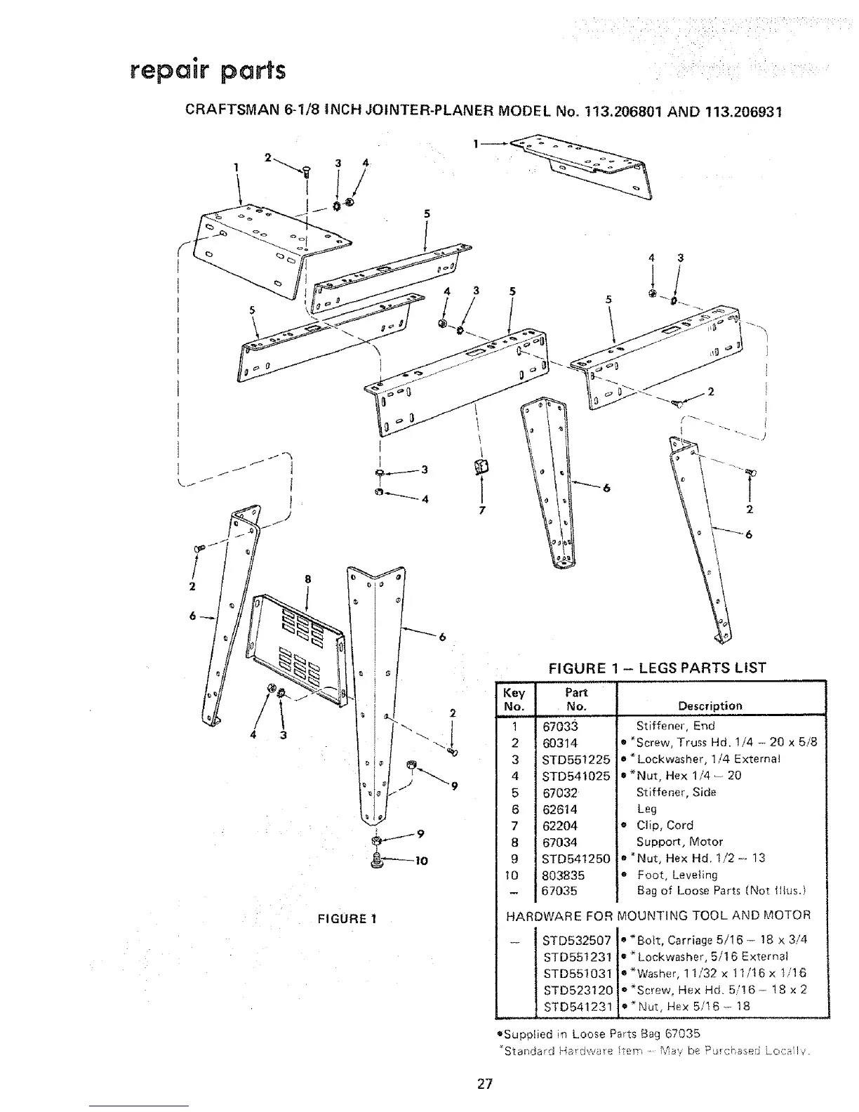 CRAFTSMAN 6-1/8 iNCH JOINTER-PLANER MODEL No. 113.206801 AND 113.206931