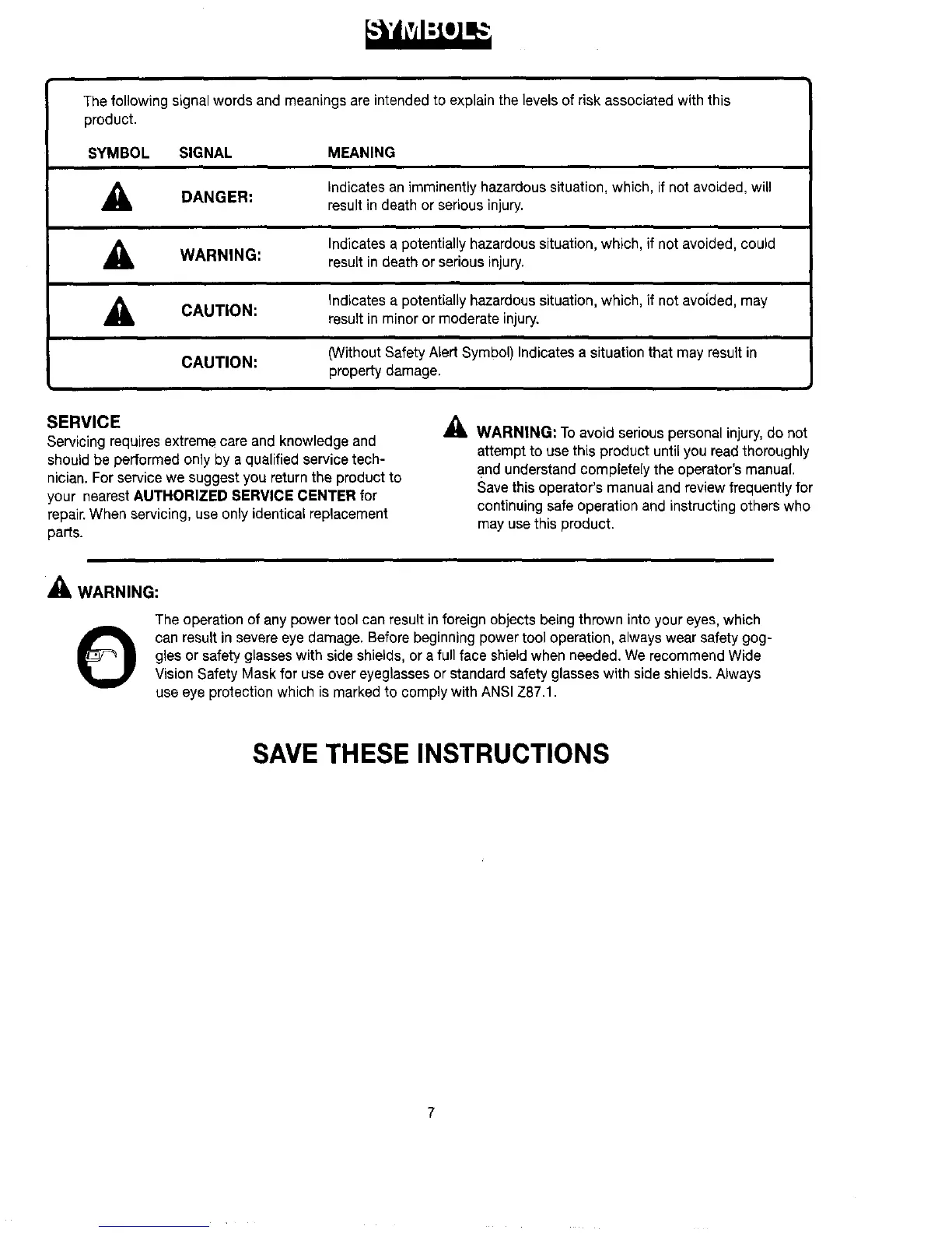 can result in severe eye damage. Before beginning power tool operation, always wear safety gog-