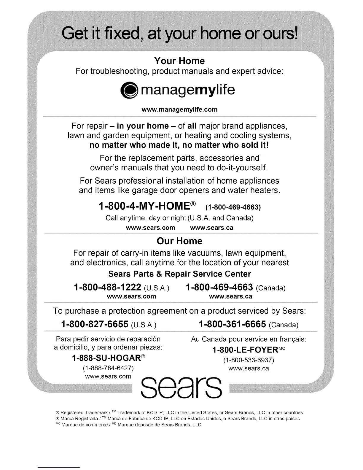 ® Registered Trademark / TMTrademark of KCD IP, LLC in the United States, or Sears Brands, LLC in other countries