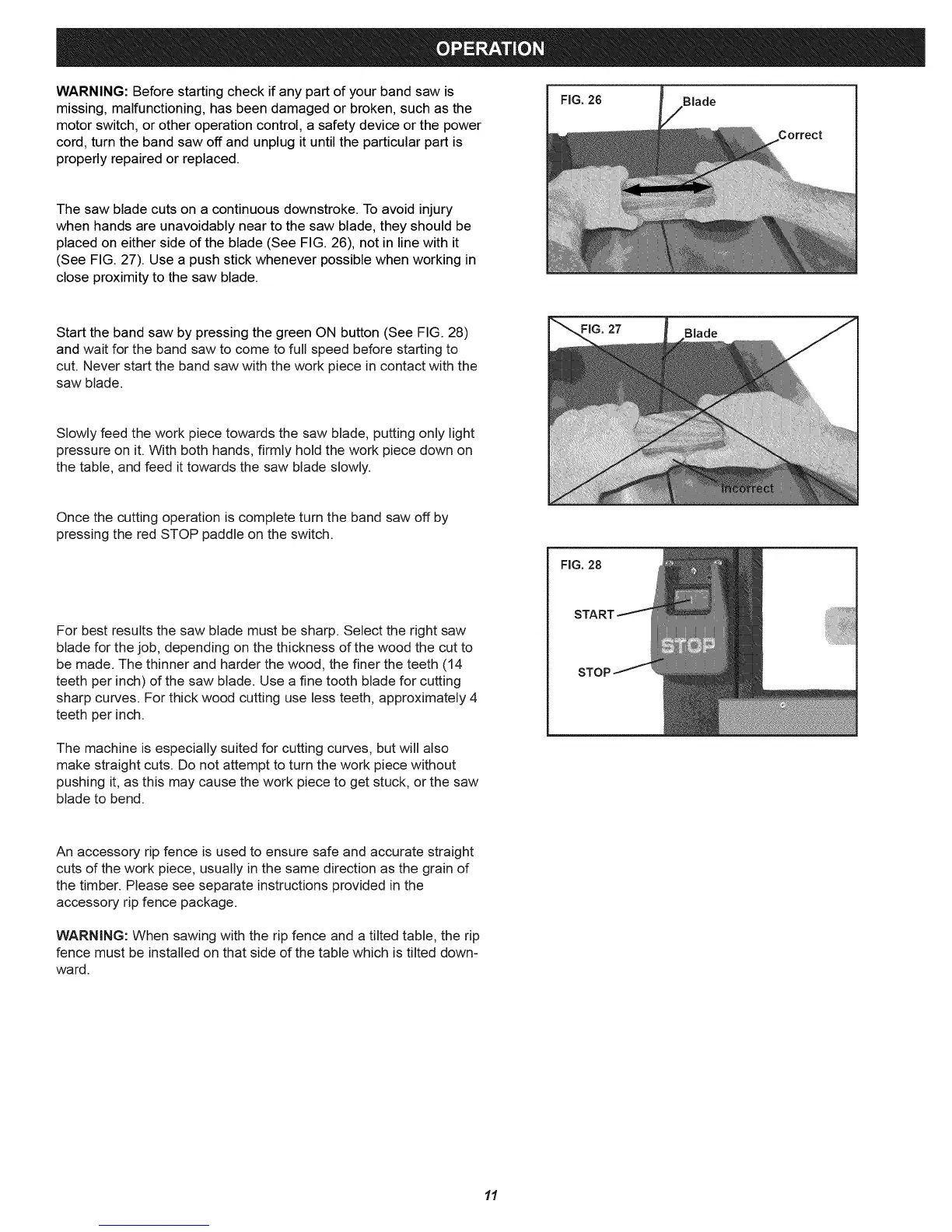 Start the band saw by pressing the green ON button (See FIG. 28)