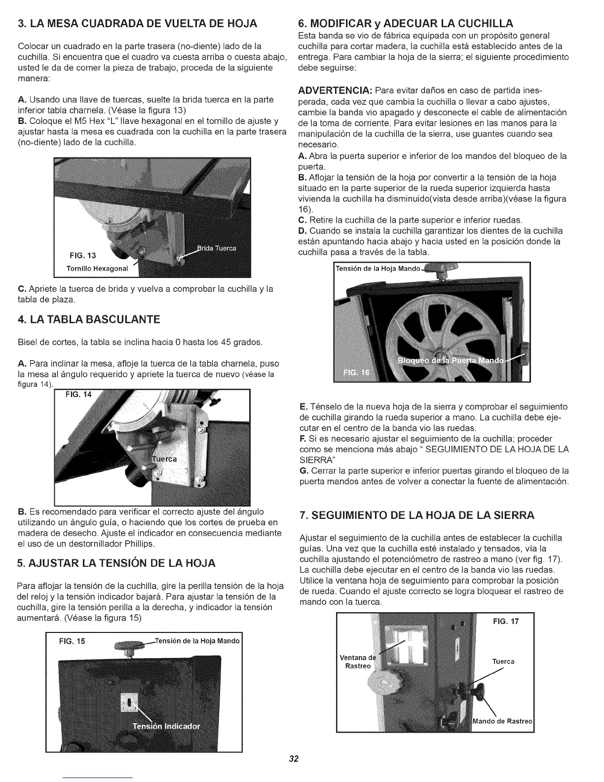 E. Tenseto de la nueva hoja de ta sierra y comprobar et seguimiento