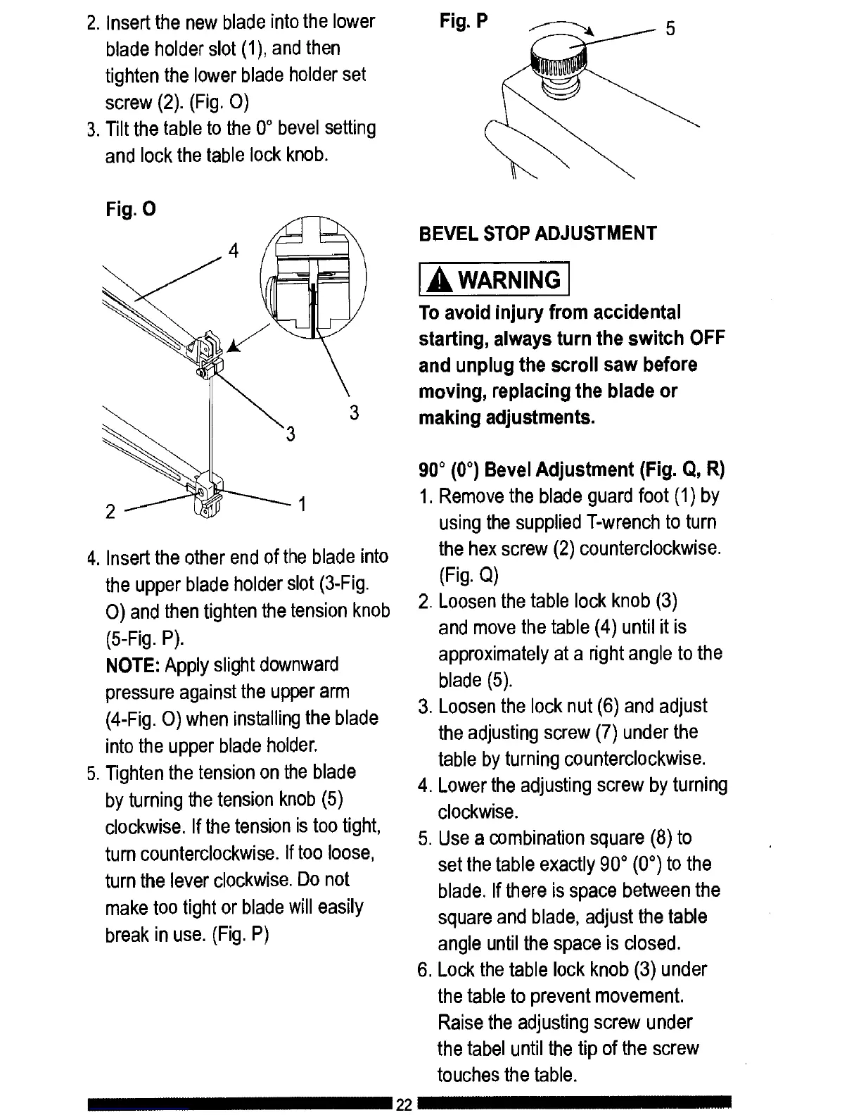 90° (0°) Bevel Adjustment (Fig. Q, R)