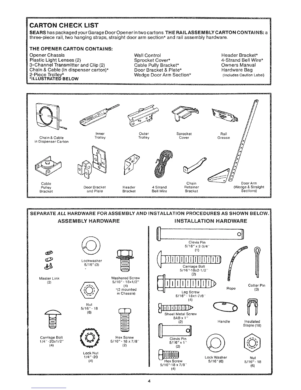 SEARS has packaged your Garage Door Opener in two cartons THE RAILASSEMBLY CARTON CONTAINS: a