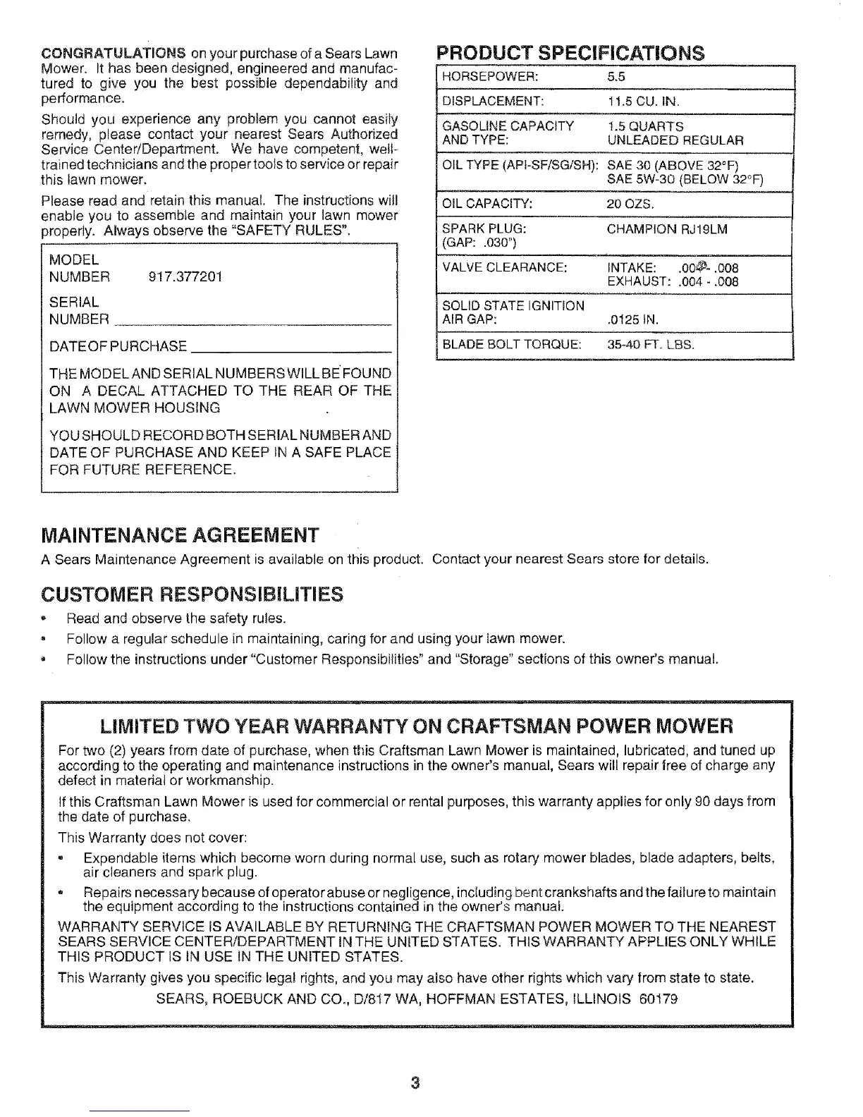 LIMITED TWO YEAR WARRANTY ON CRAFTSMAN POWER MOWER