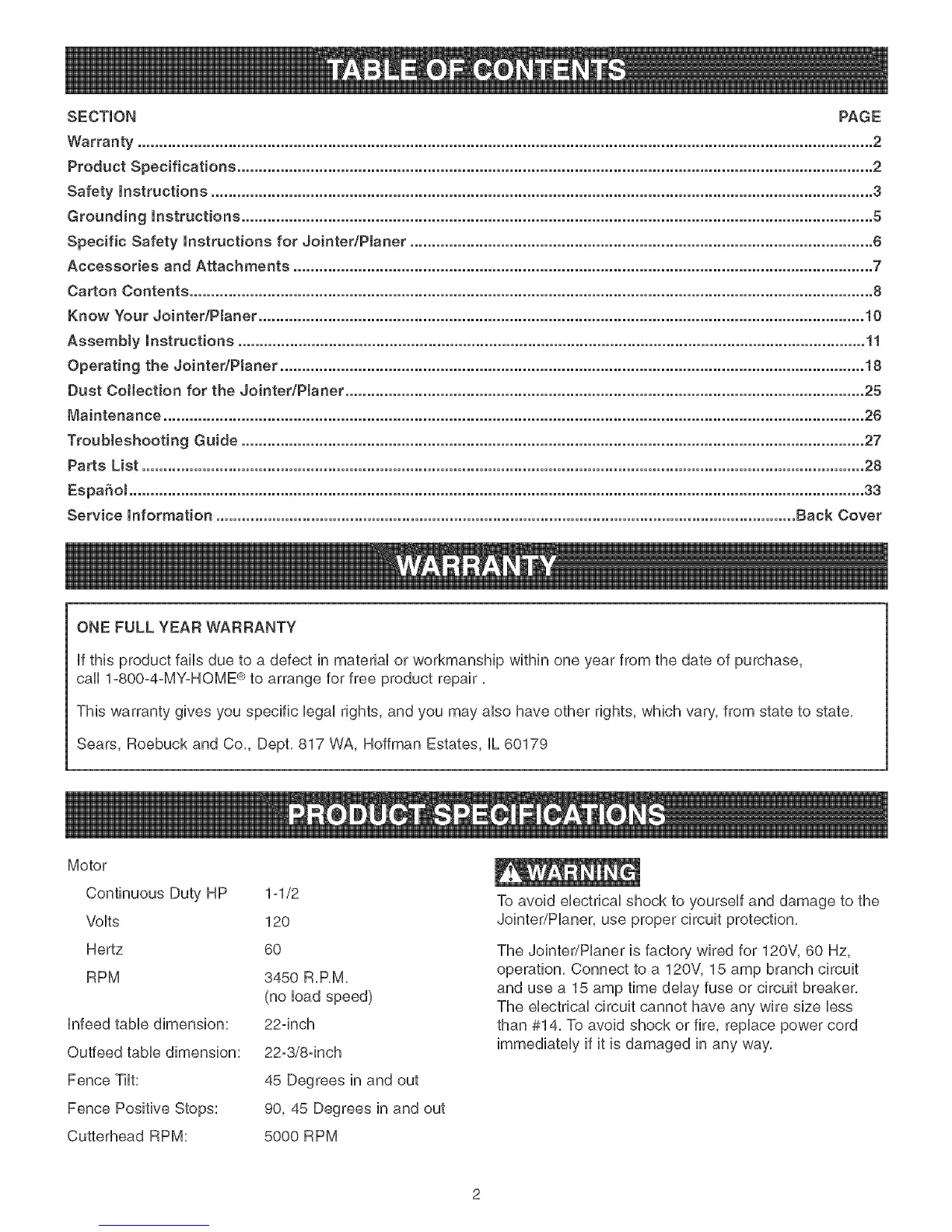 SpecificSafetyinstructionsfor Jointer/Ptaner...........................................................................................................6