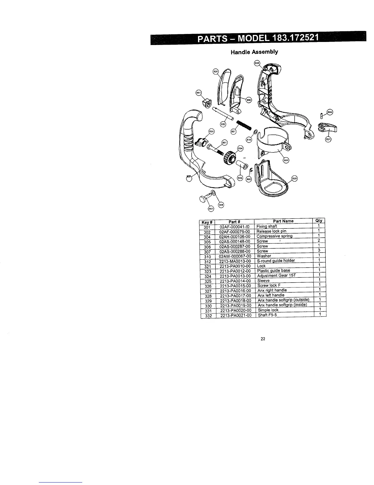 Craftsman 183.172521 - Handle Assembly Parts; Handle Assembly Components