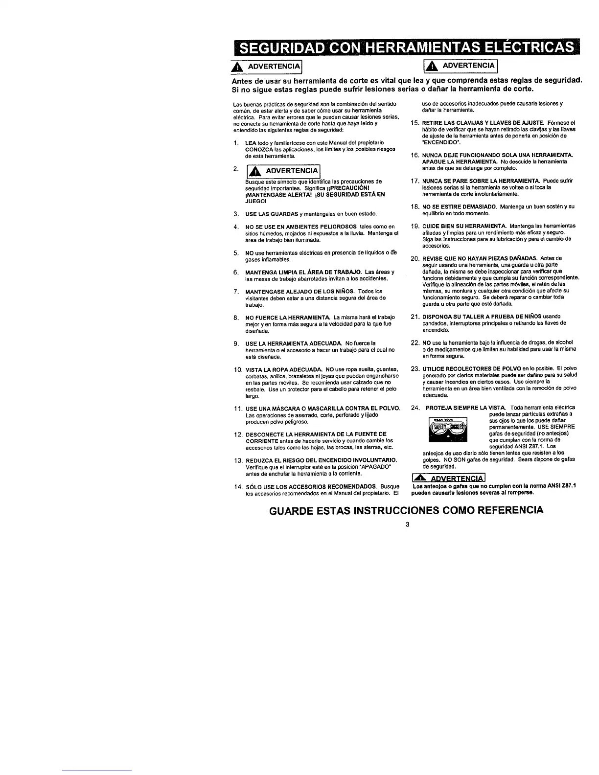 Si no sigue estas reglas puede sufrir lesiones serlas o dar_ar la herramienta de corte.