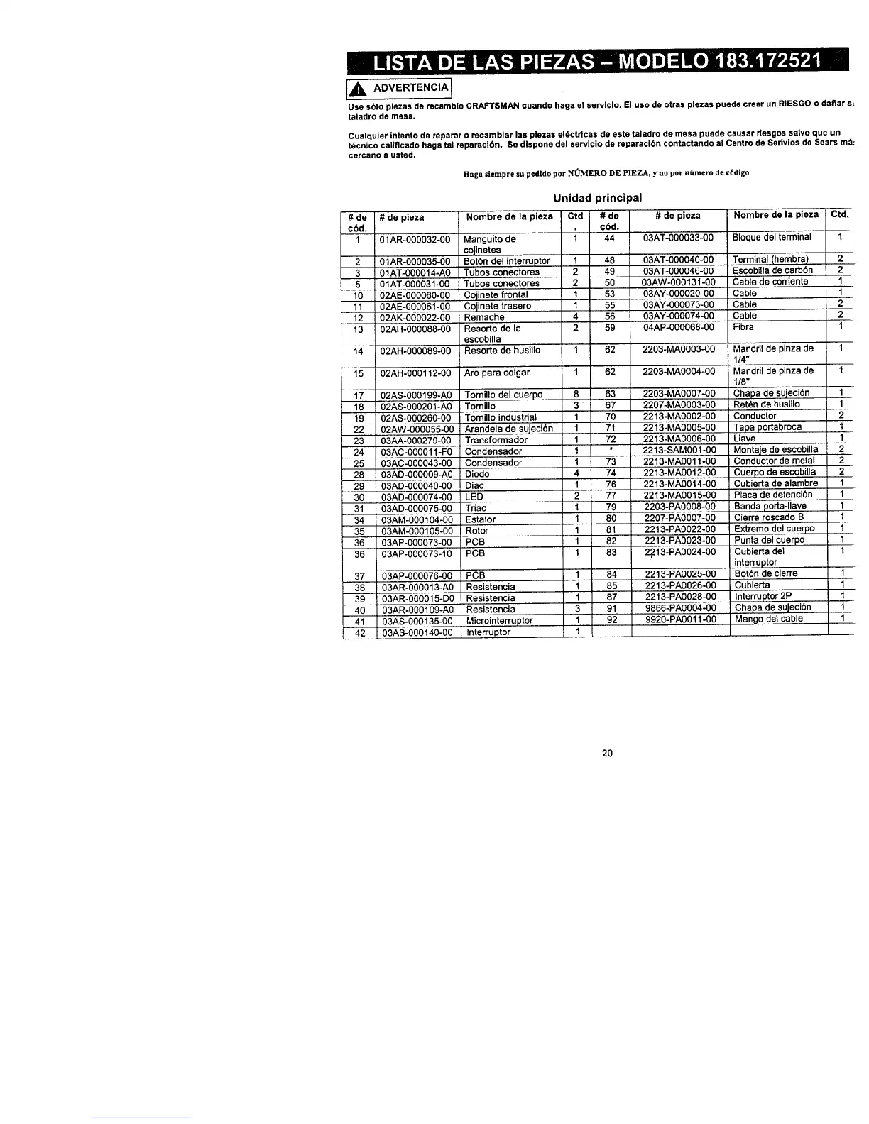 Use s61oplezas de recamblo CRAFTSMANcuando haga el servlclo. El uso de otras piezas puede crear un RIESGO o dafiar s_