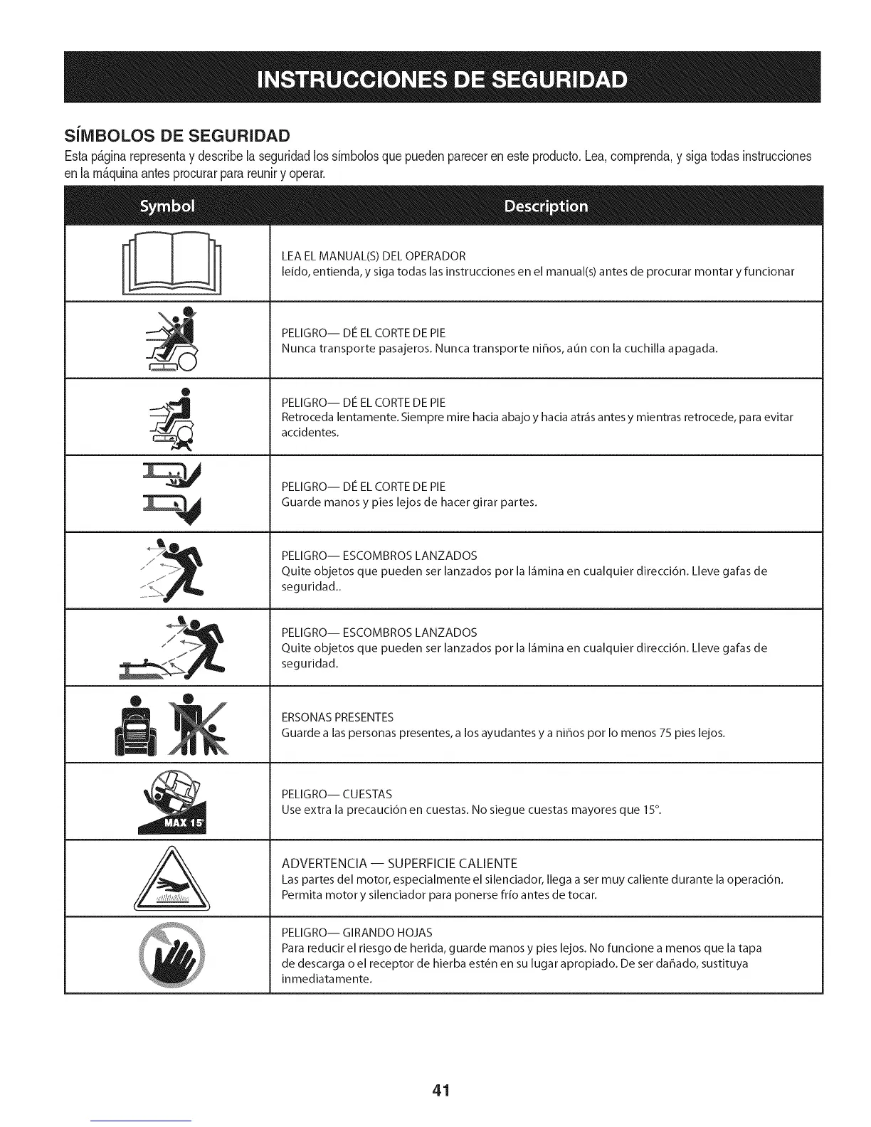 Use extra la precauci6n en cuestas. No siegue cuestas mayores que 15°.