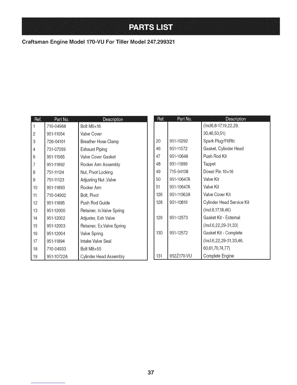 Craftsman Engine IViodel 170=VU For Tiller IViodel 247.299321