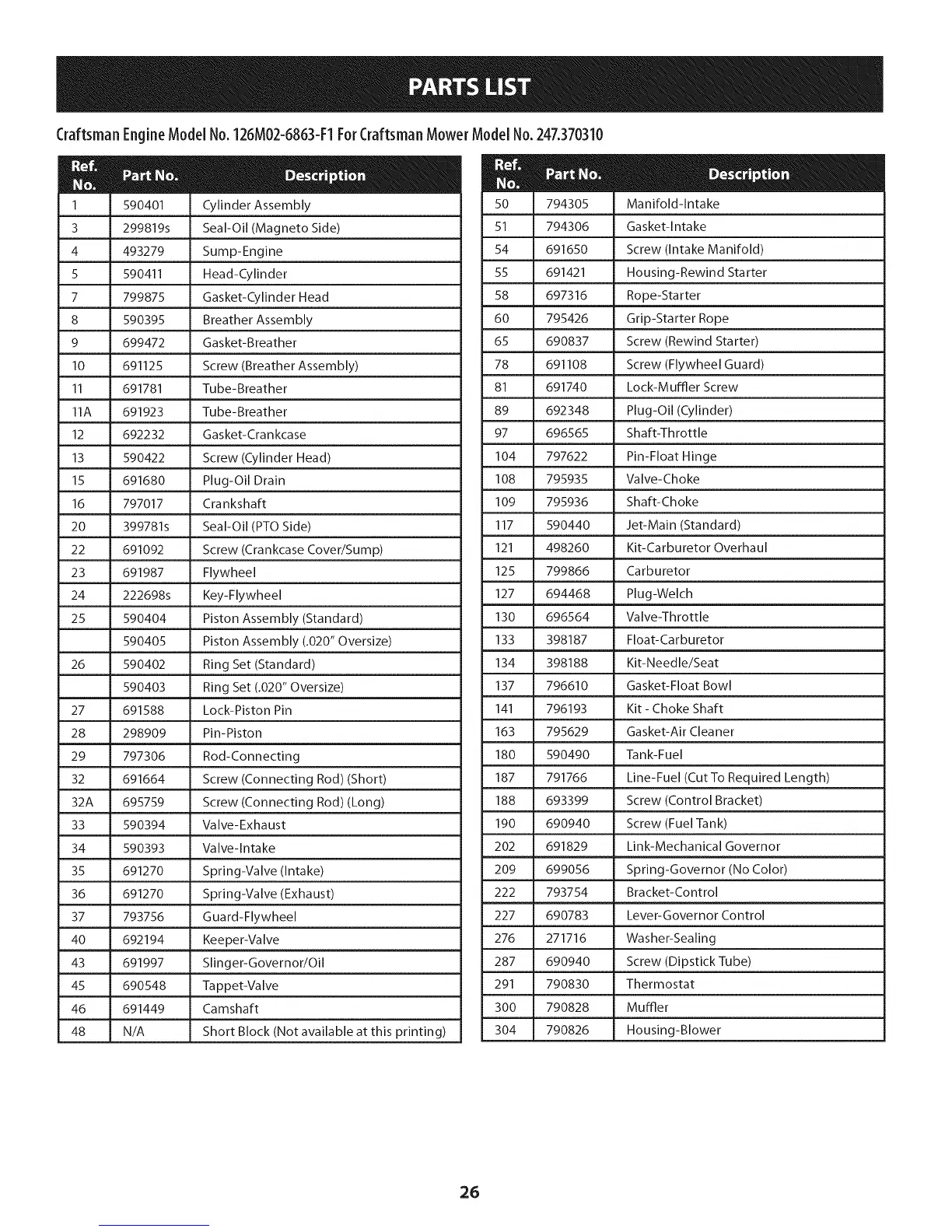 Craftsman Engine Model No. 126MO2-6863-F1For CraftsmanMower Model No.247.370310