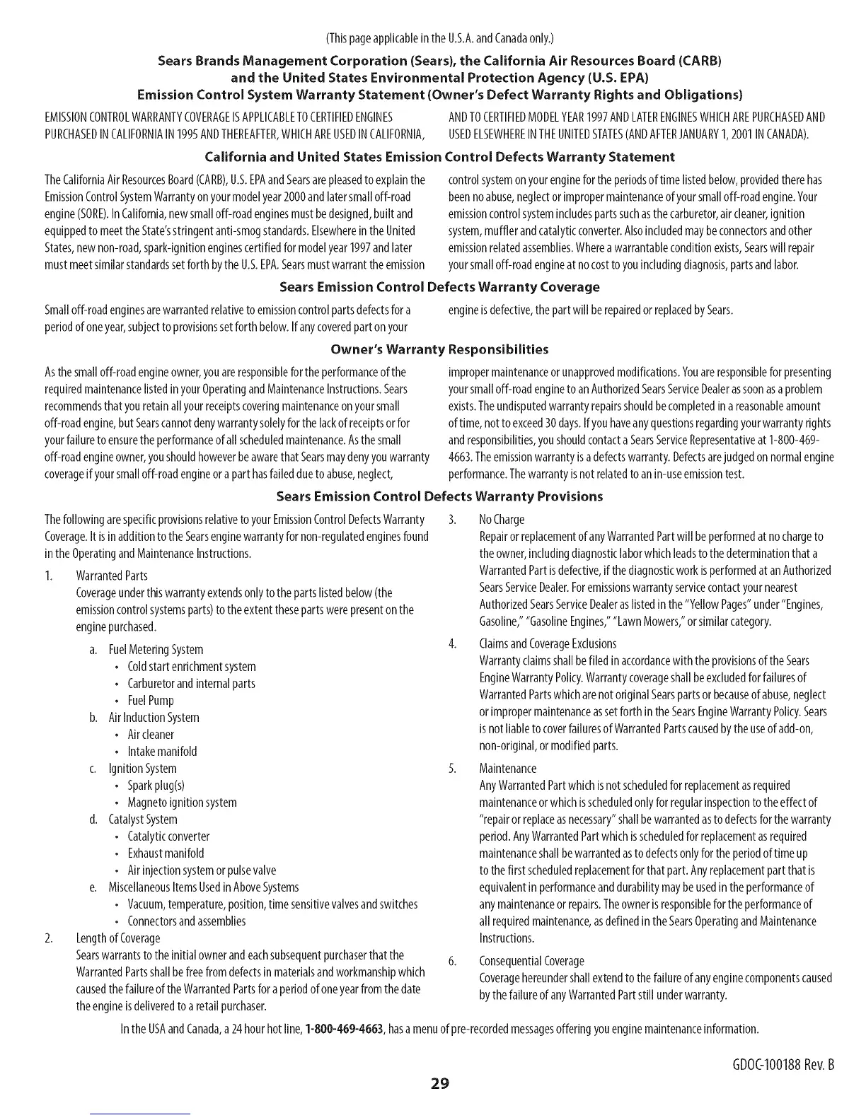 Sears Emission Control Defects Warranty Coverage